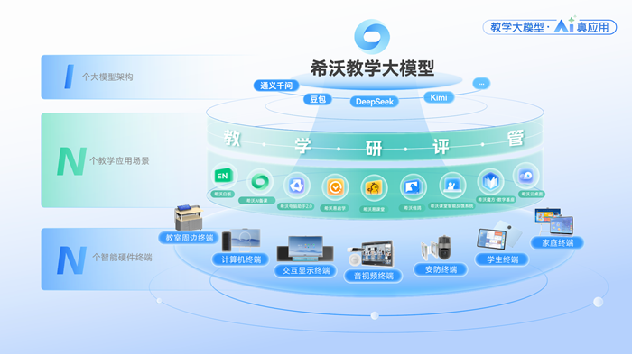 以希沃“1+N+N”AI技術體系實踐為例,希沃基于自研的希沃教學大模型基礎上,提出并構建「1+N+N」AI技術體系,即「1個希沃教學大模型架構+N個教學應用場景+N個智能硬件終端」,構建起覆蓋教學全鏈條、貫穿課堂內外、聚合行業中堅力量的教育數字化新生態,成為升級“AI+教育”的技術底座。