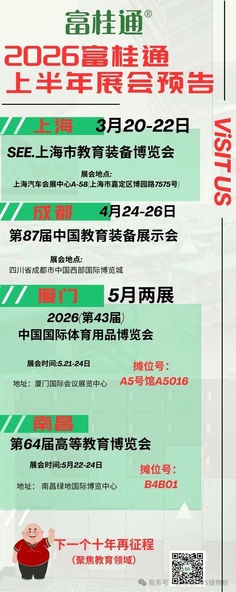 春風(fēng)送暖,萬(wàn)物向新!2026年上半年,富桂通將以飽滿的熱情奔赴上海、成都、廈門、南昌四大城市,攜最新教育裝備解決方案與儲(chǔ)物解決方案亮相行業(yè)頂級(jí)展會(huì)。我們期待與您面對(duì)面交流,共同探討教育裝備與國(guó)際體育裝備品的創(chuàng)新未來(lái)!