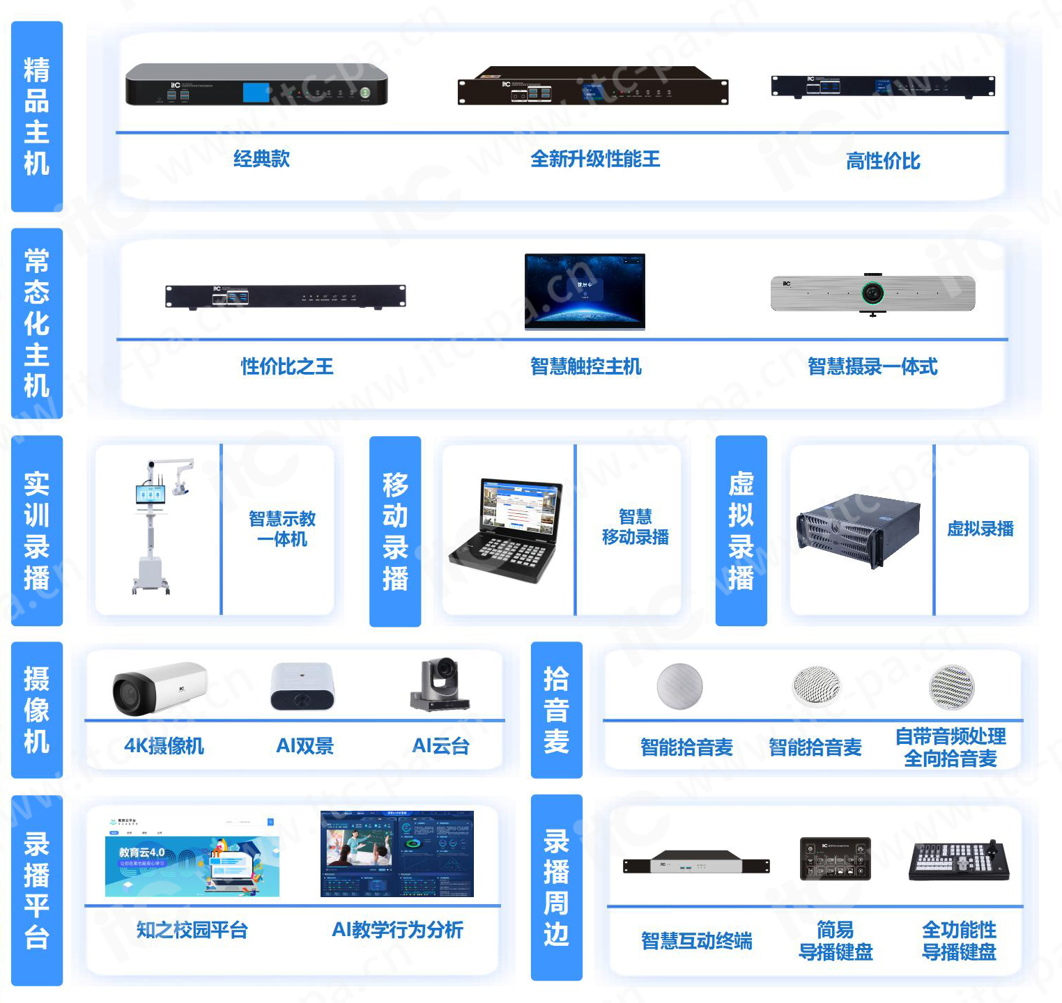 itc擁有常態化、精品機架式錄播主機、智能交互式錄播主機、攝錄一體錄播主機、移動錄播主機、實訓推車、虛擬錄播主機等錄播產品。