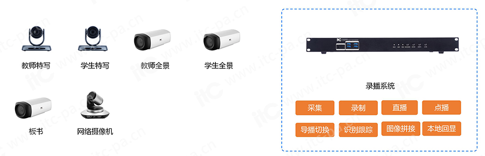 itc自主研發的全套系統周邊產品,如多樣式“一機雙景”槍機攝像頭、云臺跟蹤攝像頭、高保真拾音麥、教學互動終端、導播設備等,完美適配系統。