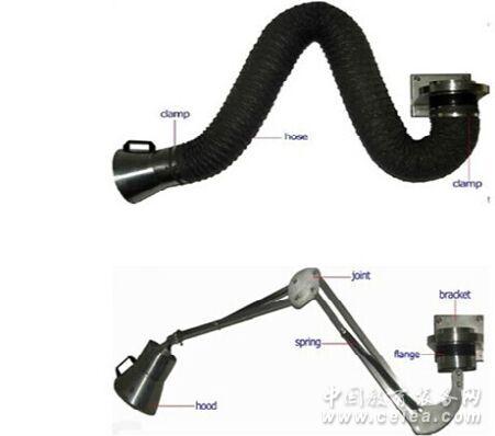 (1)萬向柔性臂的外臂管為進口優質PVC與玻纖復合螺紋鋼絲管,具有耐高溫-70——+250攝氏度(瞬間溫度+300)、耐腐蝕、臂薄質輕、彈性適中等特點; (2)管內全支承架為一組自平衡式連桿機構,具備全方位懸停的特點,拉動罩口上的手柄,便可輕易的將吸氣罩口拉伸到其臂長所能達到的任意位置(臂長可根據用戶需求制造不同的長度),并懸停在理想位置狀態進行煙塵的吸收,不需任何輔助支承設施。 (3)吸氣罩口可以隨吸氣臂360度旋轉,使用更加的方便靈活。無論操作者位于吸氣臂的任何方位,都能將吸氣罩放置到最佳的吸收位置。 (4)柔性吸氣臂與固定式管路系統比較,柔性吸氣臂具有無可比擬的性能優勢,能適應各類無法安裝吸氣管路的復雜工況。