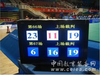 柔道比賽上場裁判員顯示系統是柔道比賽中用于上場裁判員抽簽后錄入、無線發送、無線接收和顯示的一種操作系統。 比賽前由上場比賽雙方的教練員在場外進行抽簽,抽簽后將結果錄入計算機,得到確認后將抽簽數據通過無線發送控制機分別發送給場內的二臺無線數據接收控制機,接收控制機根據比賽臺號將本場比賽上場的裁判員號碼和下一場準備上場的裁判員號碼在顯示屏上顯示出來。本套系統可供二個比賽場地使用,增加設備后可供三個比賽場地使用。