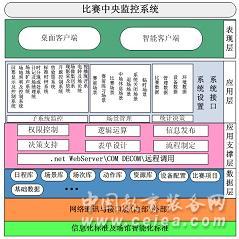 圖示是比賽中央集成管理系統(tǒng)的分層邏輯模型,整個(gè)邏輯結(jié)構(gòu)由四級中間核心層、一個(gè)通訊接口體系、一