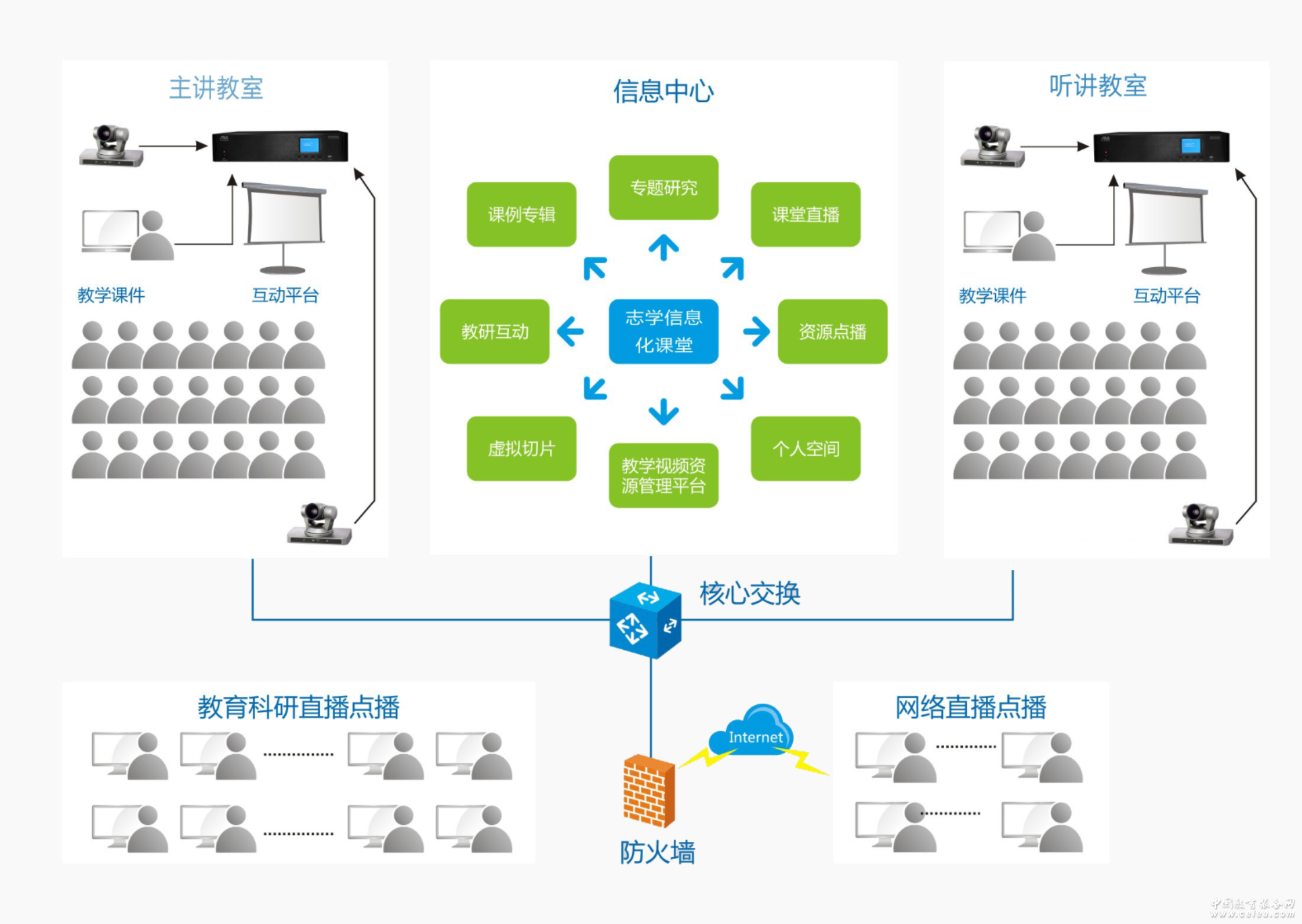 產品詳細介紹 志學信息化課堂借助現有的班班通設備,實現了同所學校分校區多個教室間的實時互動教學,還可以使優質教學資源在本校常態化教學的過程中,同步輻射到其他地區學校,同時滿足了在線學習內容的創建,傳播和管理,實現課程網上直播、實錄、點播和課程網絡化,擴大優質教育資源覆蓋面的有效機制,逐步縮小區域、城鄉、校際差距。 產品特點: 1、一鍵操作; 2、全面監管; 3、雙屏顯示 4、實時畫中畫直錄播; 5、多終端游覽; 系統功能: 1、視頻互動; 2、教學協同; 3、同步播放; 4、直錄播; 5、教育云資源; 應用場景: 1、遠程互動教學; 2、遠程評課; 3、網絡教研; 4、名師課堂;