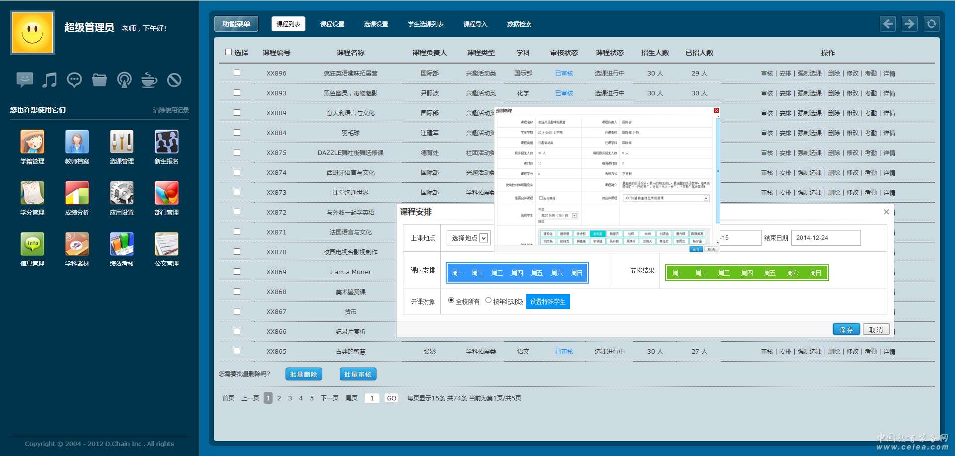 選課設(shè)置 課程類型樹形方式的自定義設(shè)置、年度學期的上課時間和上課地點的設(shè)置。 課程設(shè)置 每個年度學期對選課開關(guān)、選課開放年級、學生每學期最多選課門數(shù)、選課最大學分限制、學生退課限制等進行自定義設(shè)置。 選課申報 課程名稱設(shè)置、任課教師設(shè)置、教學班名稱、選課的開始與結(jié)束時間、最大招生人數(shù)、最小開班人數(shù)、每班最多招生人數(shù)、課時數(shù)、學分、考核方式、課程類型等自定義設(shè)置,并且支持批量導(dǎo)入。 課程安排 課程申報完成后,需要相關(guān)負責人審核,審核通過后,設(shè)置課程上課地點安排、上課時間進行安排、以及該課程的開放對象以及特殊學生剔除條件。 學生選課 學生在開放的待選課程中進行在線選課,選課完成后,教師對學生選課進行審核,也可開啟自動審核的模式。 課程考勤 根據(jù)教師上課時間自動生成考勤的表單,任課教師在線打考勤。 學生學分 任課教師根據(jù)學生學習情況和考勤,為學生打?qū)W分,未通過學生生成補考通知。 統(tǒng)計分析 課程選課情況統(tǒng)計、未選課學生統(tǒng)計、已選課學生統(tǒng)計、未考試通過學生統(tǒng)計、上課考勤統(tǒng)計。 |