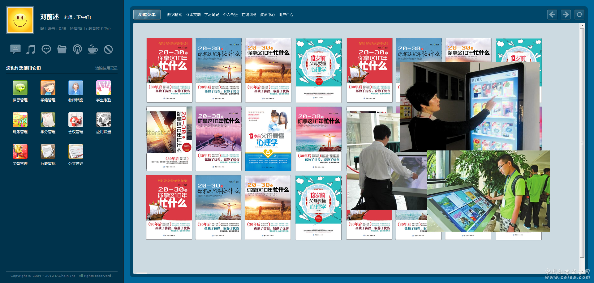 用戶中心 構(gòu)建全校師生電子借閱檔案,記錄用戶借閱記錄等基本信息。 資源中心 實現(xiàn)對書籍分類、目錄、內(nèi)容的全面管理。 在線閱覽 教師與學(xué)生實現(xiàn)圖書的在線閱覽與查看。 個人書簽 方便教師與學(xué)生記錄圖書查看進(jìn)度,可實現(xiàn)對圖書查看的個人標(biāo)識。 學(xué)習(xí)筆記 教師與學(xué)生通過此功能可實時記錄與錄入學(xué)習(xí)筆記內(nèi)容,可按筆記或書籍檢索查看。 閱讀交流 可實現(xiàn)對閱覽同一書籍的教師或?qū)W生發(fā)起實時交流與站內(nèi)交流。 數(shù)據(jù)檢索 自定義條件進(jìn)行各類圖書數(shù)據(jù)搜索。 |