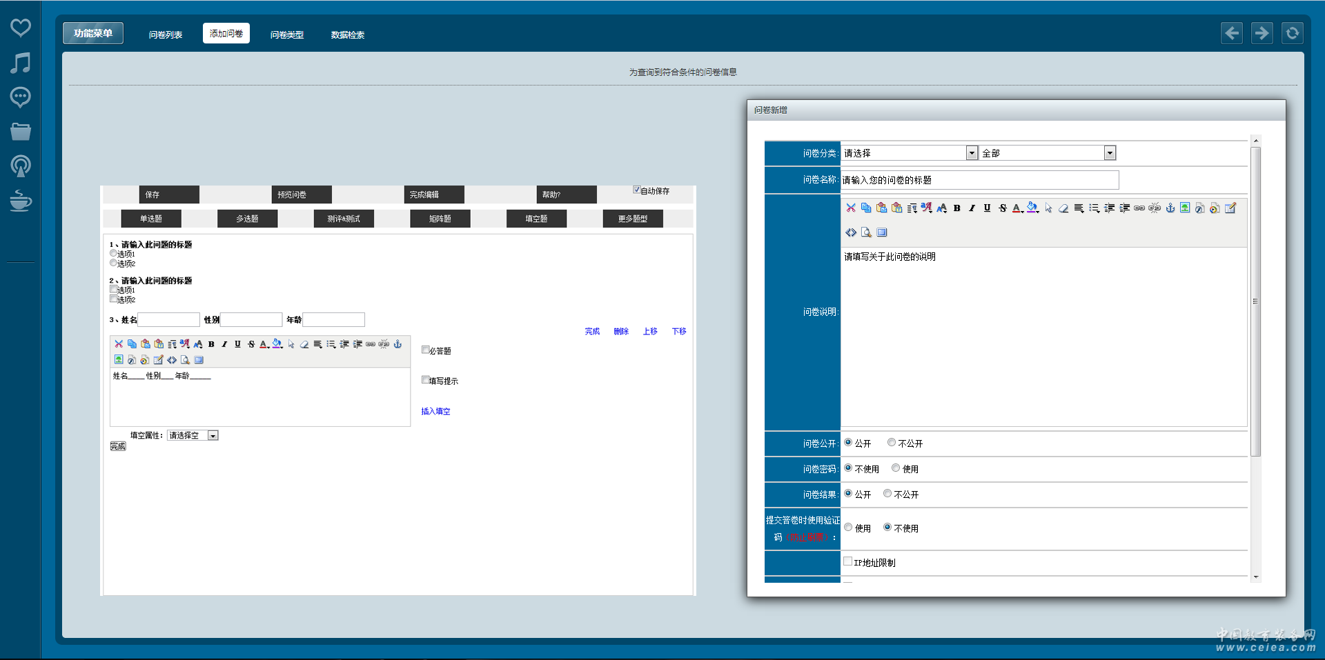 基礎管理 包含了問卷的類型自定義設置,問卷的自動復制功能、發布問卷、停止問卷、問卷檢索等操作。 自定義問卷 主要包含問卷的歸類、名稱、說明、問卷的公開情況、問卷密碼設置、問卷防刷票設置、問卷結果是否公開、問卷是否允許評論的設置、問卷的起止時間、問卷的最大的作答人數設置、以及問卷的試題內容(包含各種問卷類型試題的設置、以及問卷的提示、選項等)的設置等,還包含了問卷的預覽。 問卷作答 針對已經發布出來的問卷進行在線作答,作答完成以后根據問卷的開放情況查看問卷統計及結果并針對問卷進行評價。 問卷分析 主要是采用圖形報表(柱形、線性、餅形、條形)的形式針對問卷每道試題進行相應的分析。同時對評論提取精華貼進行標注。 防刷票機制 包含IP限制、時間段填報限制、電腦限制、賬號限制等驗證的后臺處理機制。 |