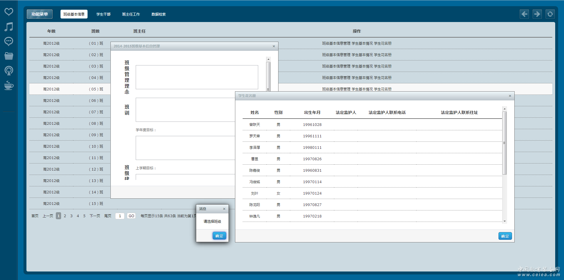 班級基本信息 主要是班主任在每個年度和學(xué)期對班級管理理念、班訓(xùn)、班級建設(shè)總目標(biāo)、班級上學(xué)建設(shè)目標(biāo)、班級下學(xué)期建設(shè)目標(biāo)、班主任學(xué)年工作總結(jié)等設(shè)置、班級花名冊、學(xué)生基本情況設(shè)置。 班主任工作 每個年度學(xué)期班主任對工作計劃、工作理念、工作感悟和反思的設(shè)置。 學(xué)生班干部 自定義設(shè)置學(xué)生干部類型、同時班主任設(shè)置本班的學(xué)生會、團(tuán)委、班委、宿委、課代表、小組長的設(shè)置,并生成班干部報表。 晚自習(xí)管理 主要是班主任針對當(dāng)前學(xué)期所執(zhí)教班級學(xué)生上晚自習(xí)的設(shè)置,并生成學(xué)生上晚自習(xí)的報表。 新學(xué)期報到 主要是每個學(xué)期開始以后班主任針對學(xué)生的報道情況進(jìn)行登記,同時對學(xué)生監(jiān)護(hù)人信息、走讀方式、交通方式、是否上晚自習(xí)進(jìn)行變更處理。 領(lǐng)導(dǎo)查看 主要包含每個年度學(xué)期對各個班級基礎(chǔ)信息(班級基本信息、學(xué)生花名冊、班主任工作)、學(xué)生干部、班主任工作進(jìn)行查看匯總,并生成統(tǒng)計報表。 統(tǒng)計分析 主要是每個年度學(xué)期對學(xué)生的晚自習(xí)、學(xué)生的考勤、學(xué)生的新學(xué)期報道情況、學(xué)生住宿情況等進(jìn)行統(tǒng)計并生成報表。 |