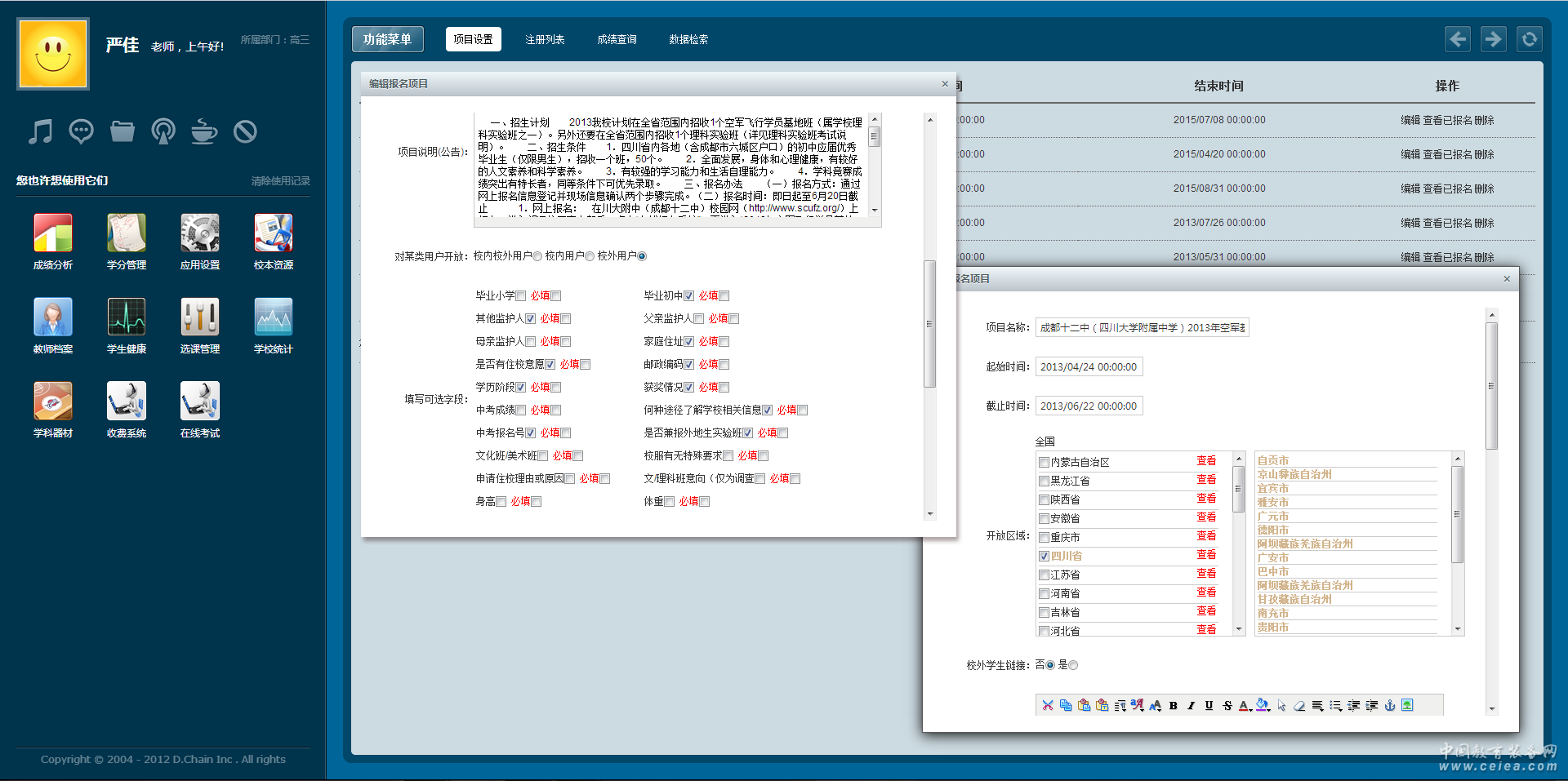 招生管理 首先是新生招生項目的設置(包含招生時間、招生區域、招生公告、招生學生填報信息自定義、打印模板)、學生報名信息(審核、打印報名)、學生注冊用戶管理(刪除、查看密碼)、學生報名考試成績上傳。 新生報名 主要包含學生在線注冊(采用身份證、郵箱便于密碼找回)、在線填報報名信息、查看報名審核、查看 錄取結果、完善學生檔案信息、打印學生檔案。 入學須知 主要包含分年度學期的常見問題、校園一卡通情況、自助政策、助學貸款申請、轉檔須知、住宿問題、 入學體檢、收費標準、學校位置、乘車路線等信息的設置,學生對以上信息進行查看。 規章制度 主要包含自定義規章制度的分類,各種章程信息的靈活設置,學生對設置的信息的查看。 學籍管理 主要包含學生學籍檔案的導入、增刪改查、學籍檔案模板自定義、班級設置、檔案導出、在校狀態變更、密碼初始化、學籍變更管理、學生學籍號更新、學生照片批量導出、學生畢業設置。 班級管理 包含了班級增刪改查(班級名稱、年級、班級編號、年度、學期)、班級導入、班主任設置、自定義班級科目及任課教師、復制生成年級所有班級。 年級管理 包含了對年級名稱、靈活設置年級層次、年級編號的設置與管理。 |