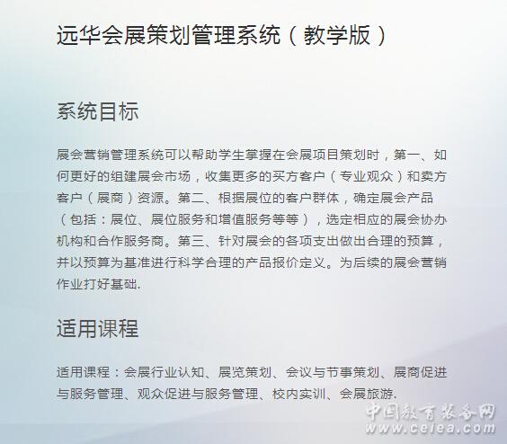 適用課程 適用課程:會展行業認知、展覽策劃、會議與節事策劃、展商促進與服務管理、觀眾促進與服務管理、校內實訓、會展旅游. |