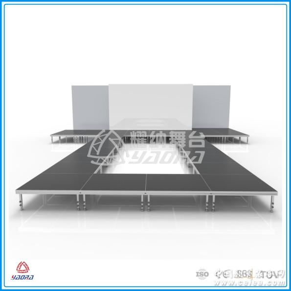 拆裝舞臺,規格是:長2米*寬1米,高0.4-2米(可定做),其舞臺面是由膠片或鋼化玻璃以及多層夾板與鋁框構成,其具有較好的防火阻燃、耐磨損、無傷害、裝飾性強等特點,舞臺框采用高硬度鋁合金材料,結構牢固,外觀漂亮。外加兩條扣管使整體結構更牢固、安全,承載能力更強。在鋁合金的舞臺中要數它最便宜。 |