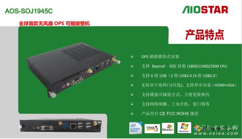 1概述編輯 Aiostar OPS 全稱為:Aiostar Open Pluggable Specification,開(kāi)放式可插拔規(guī)范。是Intel與顯示器廠商共同制定的標(biāo)準(zhǔn)化數(shù)字標(biāo)牌接口規(guī)范。OPS內(nèi)部組成是一個(gè)X86架構(gòu)的迷你PC,采用英特爾酷睿處理器,配有內(nèi)存、硬盤、多種輸入輸出接口以及Windows操作界面,尺寸為200mm x 119mm x 30mm 。 以下為Intel 官網(wǎng)對(duì)于OPS的定義: 原文如下: Digital Signage Open Pluggable Specification :Simplify digital signage development Highlights Enables easier installation, use and maintenance of digital signs. Makes digital signage devices more intelligent and connected. Overview The open pluggable specification (OPS) helps standardize the design and development of digital signage devices and pluggable media players. Intel created OPS to address digital signage market fragmentation and simplify device installation, usage, maintenance and upgrades. OPS enables digital signage manufacturers to deploy interchangeable systems faster and in higher volumes, while lowering costs for development and implementation. Installing digital signage equipment based on Intel architecture helps you implement scalable digital signage applications that can network easily with other equipment. This simplifies interoperability and application upgrades designed to meet the digital signage requirements of individual customers, while helping to future-proof technology investments.[1] 譯文: 強(qiáng)調(diào) 更便于安裝、使用和維護(hù)的數(shù)字信號(hào)。 使數(shù)字看板設(shè)備更智能和融合。 概述 開(kāi)放的可插拔的規(guī)范(OPS)有助于規(guī)范的設(shè)計(jì)和開(kāi)發(fā)數(shù)字看板設(shè)備,并插入媒體播放器終端。Intel創(chuàng)造OPS 致力于數(shù)字看板市場(chǎng)分化和簡(jiǎn)化設(shè)備安裝、使用、維護(hù)和升級(jí)。 OPS可以使數(shù)字看板制造商更快部署大量的交互系統(tǒng),同時(shí)降低開(kāi)發(fā)和實(shí)現(xiàn)的成本。 安裝基于英特爾架構(gòu)的數(shù)字標(biāo)牌設(shè)備可以幫助您實(shí)現(xiàn)可伸縮的數(shù)字看板應(yīng)用程序,并且很容易和其他設(shè)備進(jìn)行網(wǎng)絡(luò)連接。這簡(jiǎn)化了通過(guò)交互和升級(jí)的設(shè)計(jì)來(lái)滿足個(gè)人客戶的數(shù)字看板需求,同時(shí)有利于面向未來(lái)的技術(shù)投資。 2特點(diǎn)編輯 1、支持?jǐn)?shù)字標(biāo)牌等行業(yè)最新的OPS規(guī)范的電腦模塊,加速數(shù)字標(biāo)牌行業(yè)的標(biāo)準(zhǔn)化趨勢(shì)。 2、OPS模塊可以簡(jiǎn)化設(shè)備的安裝、使用、維護(hù)和更新,幫助數(shù)字標(biāo)牌制造商降低開(kāi)發(fā)和實(shí)施成本。 3、OPS可簡(jiǎn)便地與其它設(shè)備聯(lián)網(wǎng),可擴(kuò)展數(shù)字標(biāo)牌應(yīng)用,滿足數(shù)字標(biāo)牌對(duì)交互和應(yīng)用更新的需求。 4、部分OPS平臺(tái)支持遠(yuǎn)程管理及低功耗模式,解決耗電及散熱要求。同時(shí)平臺(tái)所支持的Intel vPro、AMT遠(yuǎn)程管理技術(shù),實(shí)現(xiàn)設(shè)備無(wú)人操控下的高效運(yùn)作。如采用四代i5+Q87平臺(tái)的AOS-SOQ8I45A 5、OPS無(wú)風(fēng)扇散熱設(shè)計(jì),提供超靜音的解決方案,保證工作環(huán)境的安靜、清爽。發(fā)熱量小也帶來(lái)了較小的功耗。 3整機(jī)編輯 Intel 2011年提出該規(guī)范后,伴隨著日本NEC OPS接口顯示器的上市,傳統(tǒng)數(shù)字標(biāo)牌嵌入式主板走下神壇,OPS模塊化正式開(kāi)啟。代表作品有 愛(ài)鑫微電子(AIOSTAR) AOS-SOH8I45A ,
