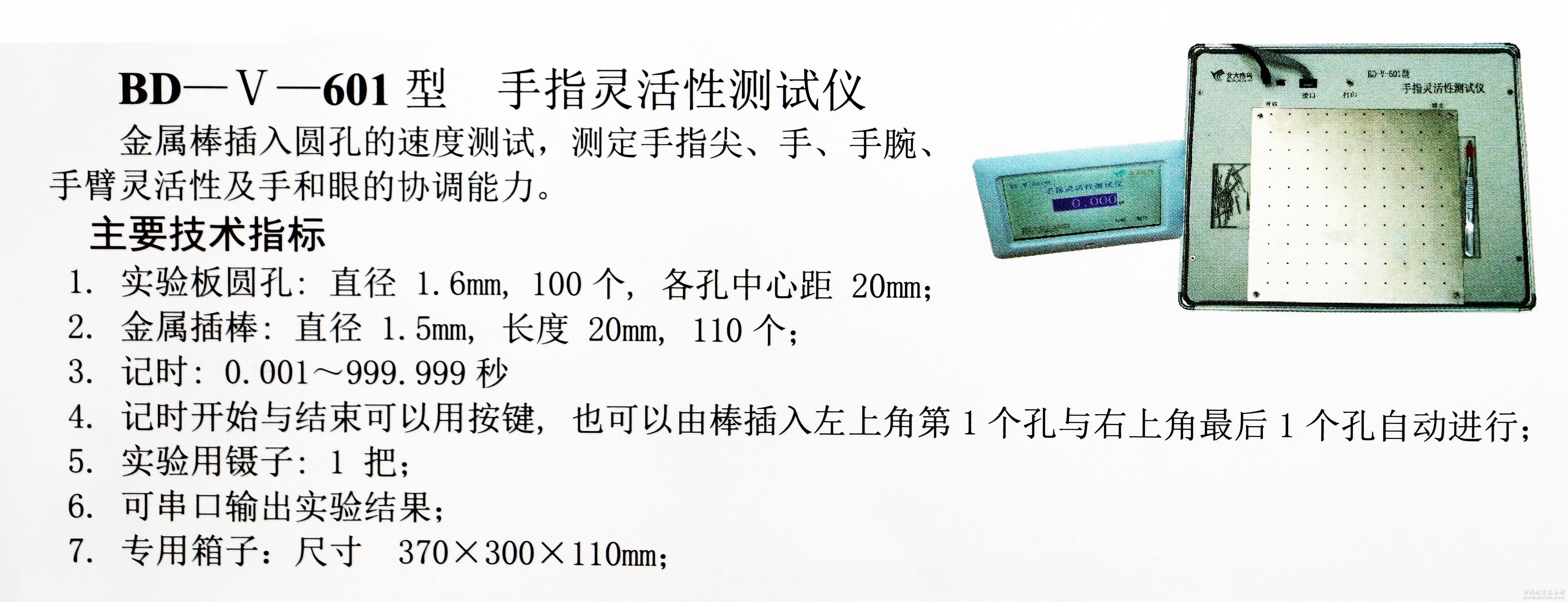 產(chǎn)品詳細(xì)介紹測(cè)定被試手指、手、手腕靈活性。也可測(cè)定被試手和眼的協(xié)調(diào)能力。