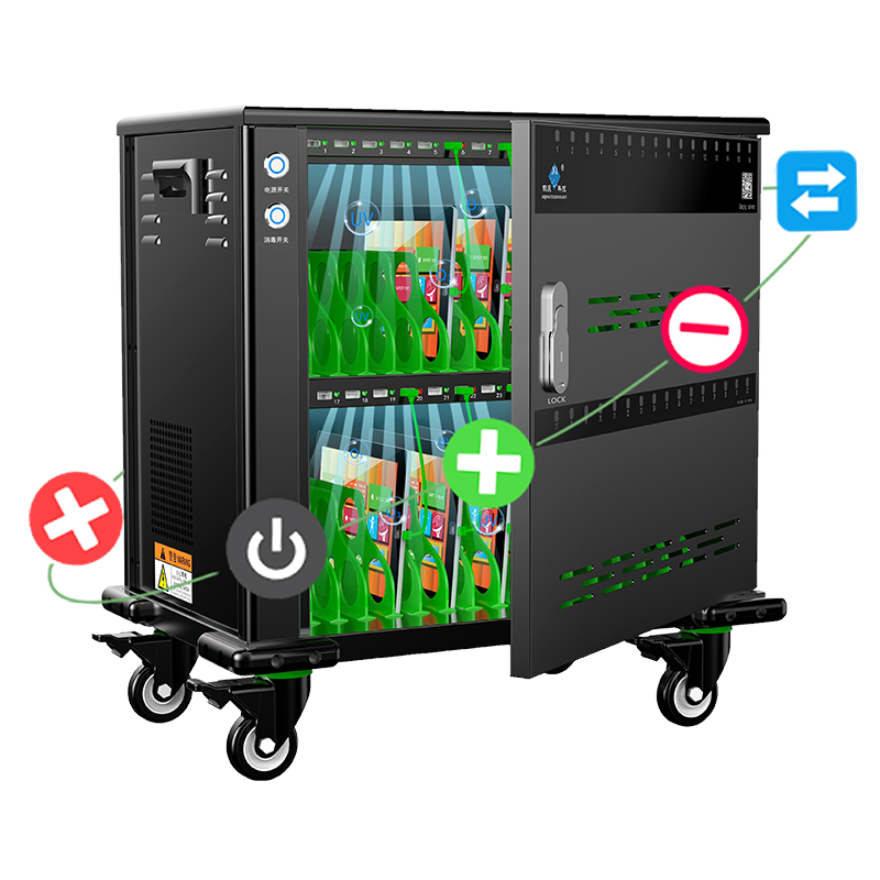 產品詳細介紹品牌:際慶科技 型號: SYNC32 Sync 32 招投(應標)參數: 功能參數: 1、32口直流充電USB 5V2.4A且每口穩定兼容HUB數據傳輸功能并對應配32條綠色數據線(充電IC芯片智能識別平板、手機等設備所需要的電流,安全、穩定、高效); 2、★每口獨立充電并具備智能LED轉燈功能(紅燈:充電狀態 中,綠燈:充滿/未連接),且有對應的數字序號; 3、★金屬按鈕開關,可過15A以上大電流,兼具電源開關和通電指示功能,單120mm風扇,搭配智能溫控系統,30℃±8自動啟停; 4、★主動式PEC節能開關電源,柜內置十重安全保護①雷擊保護②浪涌保護③過載保護④漏電保護⑤隔離保護⑥過流保護⑦過壓保護⑧短路保護⑨過充保護⑩灌流保護; 5、★自動消毒功能,紫外線+臭氧O₃雙重消毒,搭配金屬按鈕開關,啟動25min后自動關閉(選配項); 6、★定時充電具有電子顯示屏/多組設置/精準定時/倒計時設置(根據使用習慣隨意設定啟停時間段)(選配項); 7、★支持數據同步功能,能批量一鍵安裝和卸載APP,支持文件分發、文件刪除、一鍵關機等智能化管控,監測設備實時充電狀態和電量等(選配項)。 結構參數: 1、★外形尺寸≤582*599*358mm(含腳輪、防撞角),工位容積為320*200*25mm ,頂邊圓弧(≥R8)設計; 2、★兩側設有ABS工程提手,柜體四個底角加裝凸高15mm軟塑防撞角,配裝 4個3寸帶剎車天然橡膠靜音腳輪(高度105mm); 3、★二層式全黑16(每層)工位設計,配裝ABS綠色隔斷,單開前門鎖,左側艙為電源管控封閉區; 4、★門板透明視窗部分與內部充電LED燈一一對應,且有相應的數字序號,前門板與側板設有對流孔,通風散熱。 產品資質: ①★整機CCC認證(原廠蓋章證明) ②★具有商標(國際分類20和9)證書(原廠蓋章證明) ③★具有軟件著作權(原廠蓋章證明) ④★具有ISO9001:2015質量管理體系認證(原廠蓋章證明) ⑤★具有產品專利證書(原廠蓋章證明) ⑥★具有AAA企業信用等級證書(原廠蓋章證明)