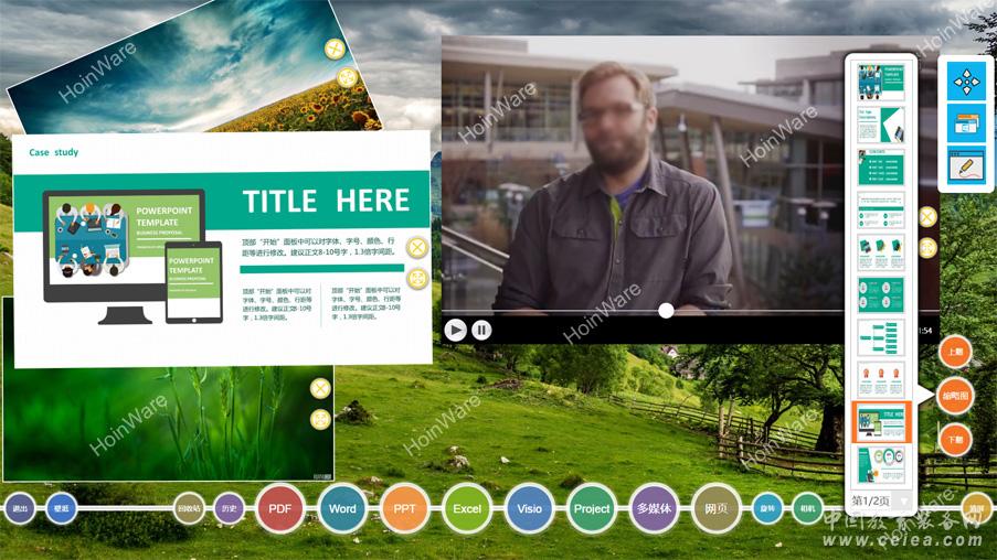 產品詳細介紹 “HoinWare專業多媒體互動教學軟件”Windows版是一款專門為多點觸摸屏設計研發的專業交互軟件,適合教學、會議、展覽展示場景的文檔和多媒體交互和展示,集多種先進交互技術、人機交互設計理念、高效率算法于一身,可同時支持MS-PPT、MS-WORD、MS-EXCEL、MS-Visio、MS-Project、PDF、高清圖片視頻、網頁9大多媒體內容的智能識別和多點觸摸互動, 并支持多文檔同時展示、標注、文檔高速切換以及縮略圖分頁導航,無縫讀取高拍儀或攝像頭圖像等強大的功能, 且無需安裝第三方軟件。可與目前主流的液晶/投影電子白板、觸控一體機、納米觸控黑板、觸控茶幾等互動設備無縫匹配。