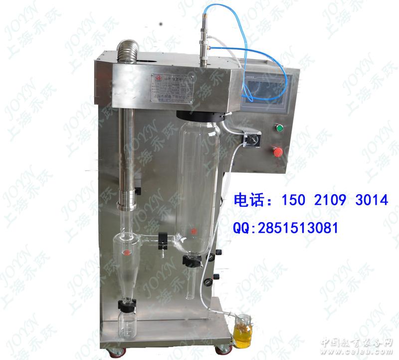 產品詳細介紹噴霧干燥機,小型噴霧干燥機,有機溶劑噴霧干燥機 為加強產品銷售、生產質量管理,保證生產過程中產品質量,確保客戶正常采購和使用,本著互惠互利,真誠合作的目的,我公司特制定質量保證內容,凡是再我公司購買的產品我公司提供的產品質保期為產品出廠之日起一年之間內,質保期內,因產品本身質量問題損壞,我公司責免費維修;質保期外,產品終身維護,如果您有需要請直接與廠家聯(lián)系,負責人:劉萍--電話:150 2109 3014 企業(yè)QQ:2851513073 上海喬躍除了生產小型噴霧干燥機以外還生產,氮吹儀,固相萃取儀,脂肪測定儀,噴霧干燥機,均質器,血液融漿機。。等等 主要特征: 1.小型噴霧干燥機采用彩色大觸摸屏操作,全自動控制和手動控制相結合,十段程序控溫,自帶記憶功能,國內唯一: 2.全自動控制:一鍵式開機,設定噴霧工藝參數后,溫度到達預定溫度,蠕動泵自行啟動,觸摸屏上顯示運行動畫,運行流程清晰顯示;關機時只需按停止鍵,機器自動安全關機。 3.手動控制:如需在實驗過程對工藝參數進行調整,可方便切換至手動狀態(tài),整個實驗過程彩色觸摸屏動態(tài)顯示(動畫)。 4.關機保護功能:關機時只需按停止鍵,機器除風機外立即停止運行,保證設備不會因為誤操作(強行關風機)而導致加熱部分燒壞。 5.噴霧、烘干及收集系統(tǒng)采用透明的優(yōu)質高硼硅耐熱玻璃材料制造,使得噴霧干燥過程在無污染及最穩(wěn)定的環(huán)境下進行,且使整個噴霧干燥實驗進程可直接觀察,為科研人員掌控實驗進程及實驗結果提供了極大的便利,并能及時發(fā)現解決問題。所有玻璃元件易拆卸,易清洗。 6.小型噴霧干燥機內置進口全無油空壓機,噴粉的顆徑呈正態(tài)分布,流動性非常好,而且噪音非常低,小于60db,符合國家實驗室噪音標準; 7.二流體噴霧的霧化結構,整機采用優(yōu)質不銹鋼材料精密制造,設計緊湊,無需附屬設備,方便使用,歷久如新。 8.為了滿足用戶在實驗范圍調節(jié)各項參數的要求,在干燥溫度控制的設計上采用實時調控PID恒溫控制技術,使全溫區(qū)控溫準確,加熱控溫精度±1℃。 9.為了保持樣品的純凈,配備了進風口過濾器。 10.進料量可通過進料蠕動泵調節(jié),最小樣品量可達50ml。磁力攪拌器可選 11.干燥后的成品干粉,其顆粒度較均勻,95%以上的干粉在同一顆粒度范圍。 12.小型噴霧干燥機針對黏性物料,設有噴咀清潔器(通針),在噴咀被堵塞時,會自動清除,通針的頻率可自動調整; 13.創(chuàng)新的塔壁吹掃裝置,物料回收率更高。 14.自動清掃功能,大大加強干燥樣品回收率。 15.干燥塔自動清洗功能,無需手動清洗,大大節(jié)省實驗時間。