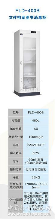 產品詳細介紹FLD-400B檔案圖書消毒柜 檔案、圖書消毒柜是一種用于檔案文件、圖書資料滅菌的專用設備。它采用微電腦自動控制技術,能殺滅沾染在檔案文件、圖書資料的大腸桿菌、金黃色葡萄球菌、肝炎病菌、霉菌及各種害蟲,用戶根據檔案圖書等受污染程度,可選擇不同的的控制時間,進行滅菌殺蟲,本產品具有殺蟲消毒效率高、無死角、無污染、壽命長等特點,適用于檔案、圖書、文件、信件等不可高溫消毒物品的表面消毒。 產品特點: ⊙柜體表面采用防靜電噴塑處理,安全,美觀。 ⊙顯示屏為彩屏,美觀大方。 ⊙帶溫濕度顯示。 ⊙臭氧組件采用集成模塊臭氧發生器,使用壽命超過8000小時。 ⊙微電腦控制,智能啟動,自動消毒,操作簡單。 ⊙托盤要求正面為平板結構,以方便取放書籍及資料等。 ⊙根據消毒書籍的滿載量,可以自行設定消毒時間,一般為10-60分鐘可調,消毒時間設置按5分鐘/次跳動。 ⊙消毒滅菌無死角,消毒效率高,濃度穩定在滿足消毒要求的最小濃度內。分解后,無二次污染。 ⊙通過國家專利認證、歐盟CE認證 ⊙通過ISO9001質量管理體系認證。 相關參數: 型號 FLD-400A FLD-400B 內容量 400L 托盤層數 4層 臭氧發生量 1000mg/h 電源 220V/50HZ 輸入功率 55W 時間 30-60min消毒+20min臭氧分解 顯示方式 智能數碼顯示 控制方式 微電腦自動控制 凈重 65KG 外型尺寸(高*寬*深) 1700X570X500(mm) 柜體材質說明 A:柜體采用1.0mm冷軋鋼板,全鋼結構。 B:柜體采用1.0mm冷軋鋼板,前門為5.00mm透明鋼化玻璃