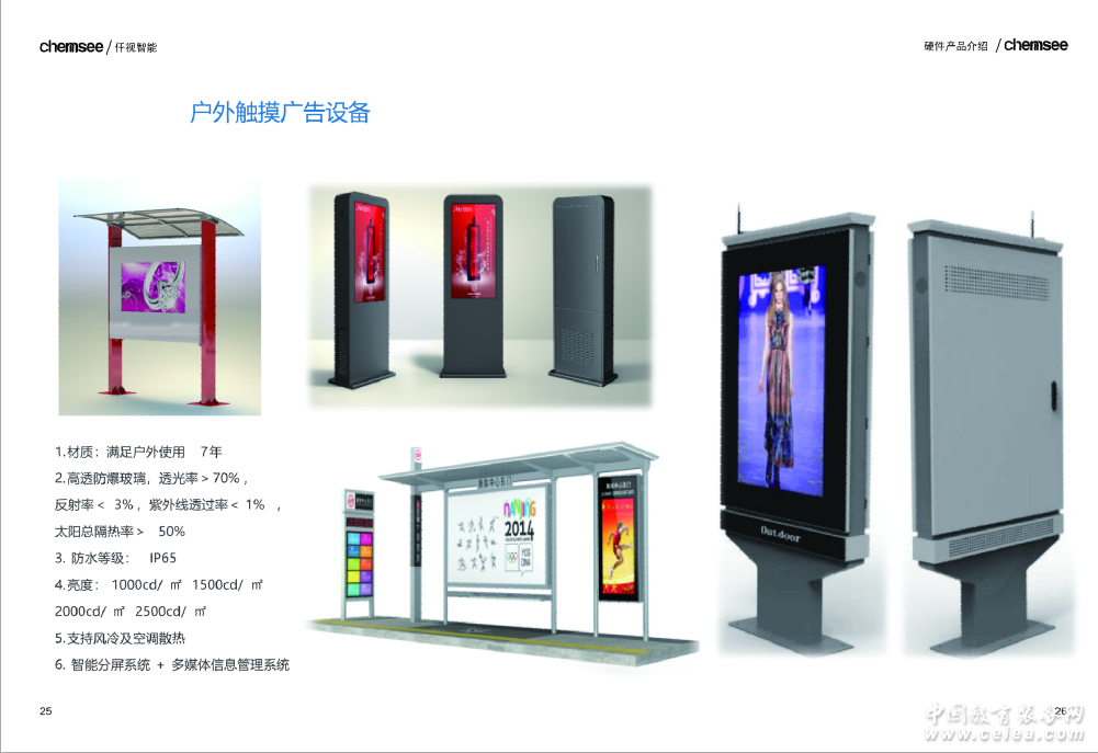 產(chǎn)品詳細(xì)介紹產(chǎn)品描述: 1.整體戶外結(jié)構(gòu)達(dá)到IP65防水防塵 2.設(shè)計(jì)采用多種安裝方式落地安裝或定制化安裝 3.采用高透光的玻璃,提高顯示屏的可視性,AR防眩光在陽光下得到更清晰的畫質(zhì) 4.采用的鍍鋅鋼板的金屬外殼,并配合戶外防銹粉,戶外防腐達(dá)到7年 5.高亮度液晶屏,亮度達(dá)到2000cd/m2 6.采用的是LED背光源,壽命達(dá)到50000小時,環(huán)保節(jié)能 7.動態(tài)對比度高,顯示畫面更清晰 8.結(jié)合散熱方案精確控溫,顯示屏7*24小時工作亮度無衰減 9.顯示屏分辨率高達(dá)1920*1080 10.采用精密的智能空調(diào)散熱和加溫,保證內(nèi)部電子元件的最佳工作環(huán)境 11.專利技術(shù)的散熱設(shè)計(jì)保證戶外55度的環(huán)境下液晶顯示屏無黑化 12.空調(diào)采用高效散熱器,環(huán)保的冷媒,制冷量更高,環(huán)保節(jié)能 13.可實(shí)現(xiàn)機(jī)柜內(nèi)部環(huán)境(溫度 濕度 振動等)監(jiān)控功能 產(chǎn)品性能一覽表 規(guī)格 32寸 42寸 49寸 55寸 65寸 75寸 85寸 可視角度 178°水平/178°垂直 對比度 3000:01:00 電源 AC200-240V/50HZ 整機(jī)功率 ≤200W ≤285W ≤285W ≤380W ≤500W ≤620W ≤700W 工作溫度 .-20°—45° 工作濕度 5%-90%RH 保護(hù)玻璃 AR減反射/超白/AG防眩玻璃 防水等級 IP65/IP55 電氣保護(hù) 高溫保護(hù) 漏電保護(hù) 定時開關(guān)機(jī) C級防雷 重量-風(fēng)冷款(Kg) 70 85 95 100 150 200 250 重量-空調(diào)款(Kg) 95 120 140 160 180 220 260 使用時間 80000小時 外殼工藝 鍍鋅鋼板+覆鋅底粉+表面戶外專用粉(戶外防腐達(dá)7年以上) 播放系統(tǒng) 電腦主板 安卓主板 遠(yuǎn)程信息發(fā)布系統(tǒng) 網(wǎng)絡(luò)傳輸 單機(jī) WIFI 3G 4G 觸摸屏 電容屏(10.1-55寸)納米觸摸(15-84寸) |