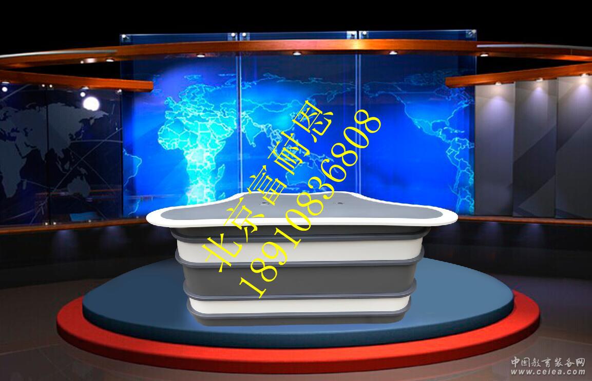 總體設計 標準型播音桌2.2米長,經典流線型設計,外形美觀大方,符合人體工程學原理,符合光學要求,鋼木組合結構,安裝方便快捷,,也可根據演播室大小,量身設計訂制。