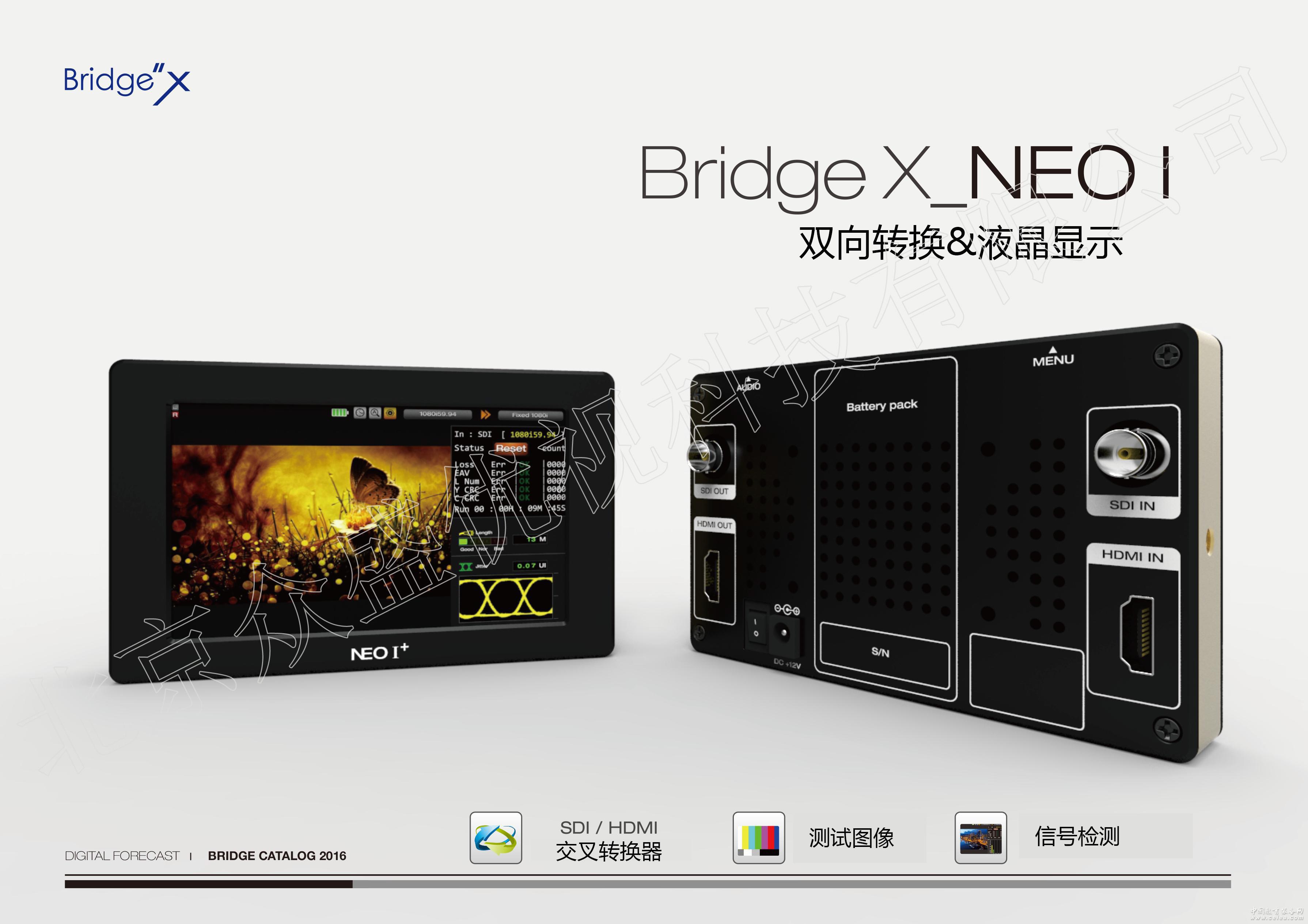 產品詳細介紹Bridge X_NEO I 支持HDMI與SDI視頻格式上下交叉轉換,具有5寸觸摸屏,可實時監測各種數據,同時支持對SDI和HDMI信號進行分析,檢查信號質量,讓視頻測量變得更容易; Bridge X_NEO I應用領域非常廣泛,可作為一個小型的監視器,也可作為便攜式信號監測儀,可監測信號源信號質量進行分析,確保輸出。