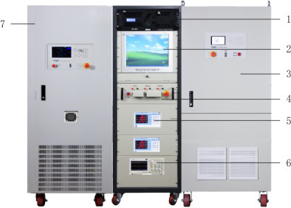 交/直流充電樁自動測試系統組成部分:1.工業計算機主機 2.顯示器 3. 可編程交流電源 4.系統控制單元 5.功率分析儀 6. 數字示波器 7.交/直流負載