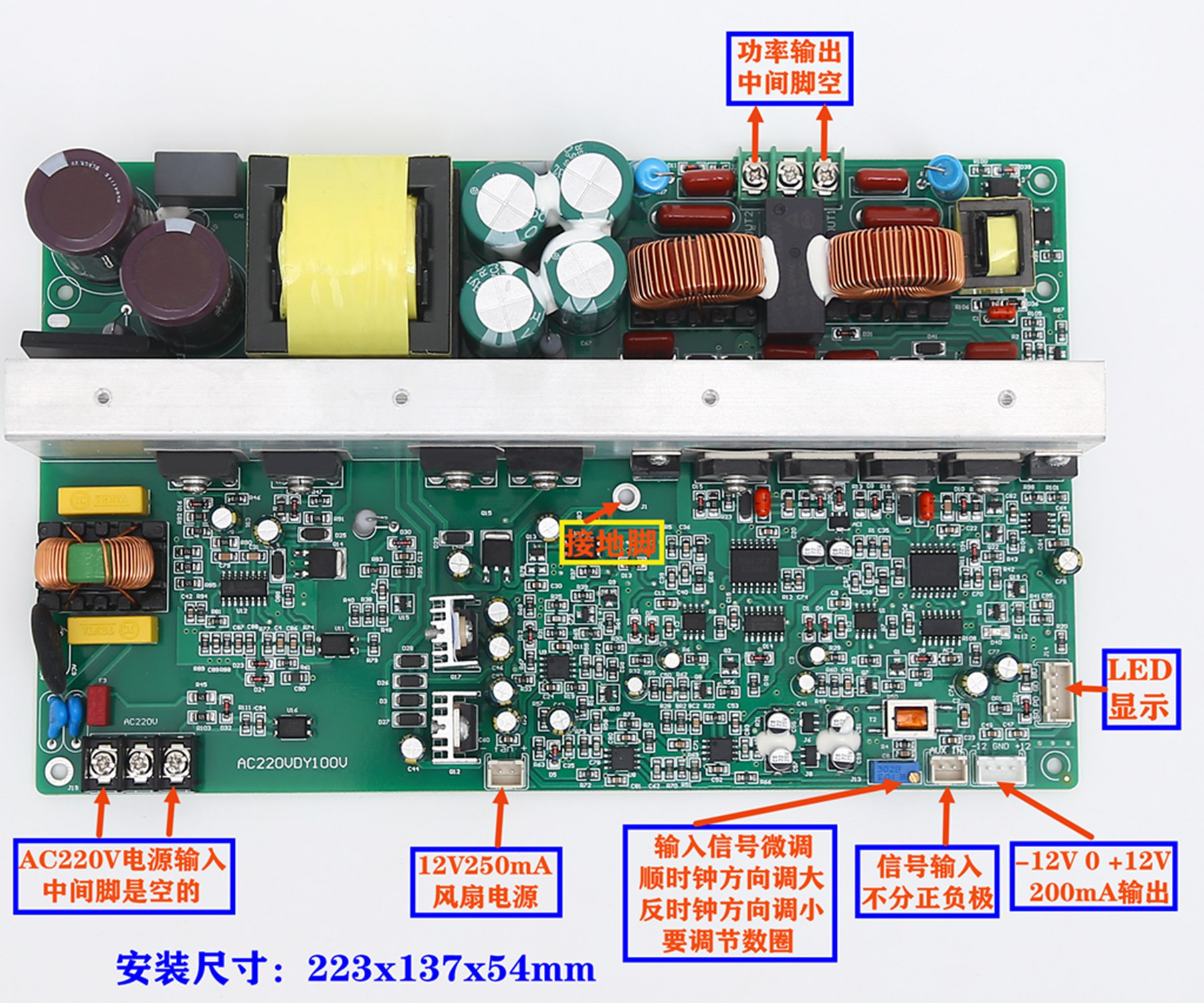 產品詳細介紹校園廣播草坪音箱大功率D類功放板模模塊,是2019版第六代出口型專業級帶電源廣播用定壓數字功放一體模塊,定電壓輸出。具有性能穩定、音質優美、信噪比高、全自動保護,效率高,無須輸出變壓器(設計、開發成功不需要傳統輸出變壓器的帶電源定壓廣播數字功放板并獲多項國家專利。),智能檢測負載內阻調整輸出狀態,降低整機生產成本等特點,其功能可以滿足廣播整機廠的要求,是開發新產品、更新產品、節約開發周期的理想配套產品。 性能指標 失 真 度:1KHz 0.1%  500w 100V 信 噪 比:86db 頻率范圍:20Hz-20KHz 定壓輸出:100V 70V 60V 根據負載自動選擇 輸出功率:100W/200W/300W/400W/500W/600W 可根據需要選擇不同功率 供電電壓:AC220V或110V 輸電源效率:91% 輸入、輸出接口: 信號輸入:0db(0.77V) 工作狀態LED顯示接口 12V200mA風機電源輸出 +-12V200mA輸出 智能風機控制 自動溫度保護 過流、短路保護 元器件選擇:IC、功放管采用美國IR公司芯片,濾波電容采用進口黑金鋼、紅寶石等、電感采用進口磁性材料,貼片阻、容采用進口件。 安裝尺寸和重量: 模塊重量:1.2Kg 安裝尺寸:100W-300W=223x130x54mm 400W-600W=223x130x70.5mm 包裝方式:二十塊一紙箱(內部20個小紙箱,各包裝一塊) |