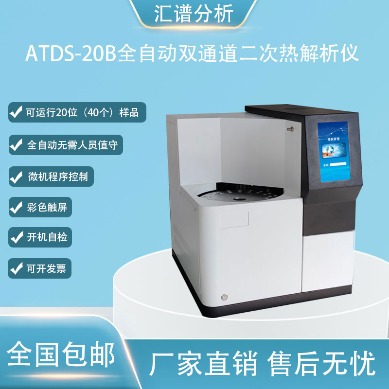產品詳細介紹匯譜分析ATDS-20B全自動雙通道二次熱解析儀 一、儀器簡介 ATDS-20B全自動雙通道二次熱解吸儀是由匯譜分析自主研制推出直接面向國內外廣大用戶的換代產品。該儀器適用于對化工建筑材料、食品、大氣及室內環境中沸點在350℃以下各種氣體的定性、定量檢測,可與國內、國外氣相色譜儀、氣質聯用儀相連,其自動化程度、重復性和靈敏度等指標能夠滿足目前國家新頒布的有關環境檢測的標準,并且在結構上具有自身獨特的功能優勢及令人滿意的性能與價格比。全自動化設計、觸摸大屏顯示、操作更為方便,可連續運行雙20位(40個)樣品的新一代全自動雙通道二次熱解吸儀。 二、儀器特點和主要功能 1、 可以自動運行雙20位(40個)樣品,無需人員值守; 2、開機自檢,故障報警和提示,自動定位、校準樣品盤; 3、計算機USB通訊接口,所有參數、方法均在PC端設置完成,7寸大屏幕液晶觸摸屏,微機程序控制; 3、 微機程序控制,主要功能有: ⑴ 方法參數設置、實時動畫顯示工作狀態、運行時間;  ⑵ 解吸區、進樣閥、樣品傳輸管和二次解吸區,四路均單獨加熱控溫; ⑶ 設定好分析程序,按下運行鍵自動完成全部樣品分析; ⑷ 可同步啟動GC、色譜數據處理工作站,也可用外來程序啟動本裝置; 4、本機自帶標樣模擬采樣的功能,可以更方便的通過熱解吸儀制作工作曲線; 5、通過時間編程,自動實現干吹、吹掃吸附、解吸、進樣、反吹清洗等功能; 6、氣路采用鈍化管路, 樣品傳輸管和進樣閥有自動反吹功能,避免了不同樣品的交叉污染; 7、采用電子制冷和二階熱脫附流程以保證得到窄的色譜峰形; 8、本機自帶標樣模擬采樣的功能,方便獲取工作曲線; 9、為了配套進口氣相色譜儀使用起來更方便準確,本儀器還配有針對各種進口儀器的專用接口,連接方便; 10、20種以上編輯方法,方便編輯保存、調用; 11、新增中英文切換、用戶管理、日志等功能; 12、進樣側孔針頭更換方便,可連接國內外所有型號的GC進樣口。