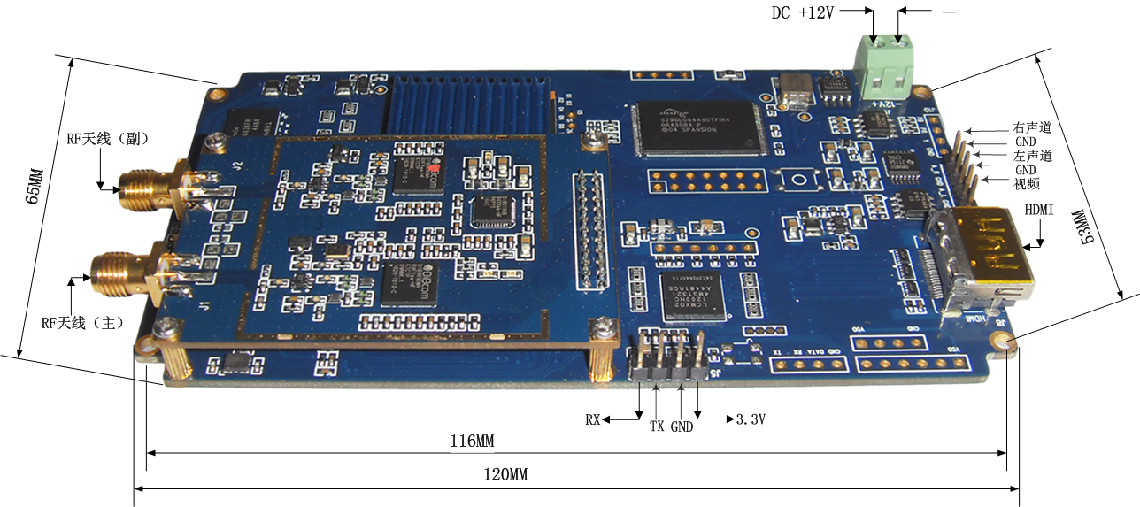2.2.2、接收端 射頻解調部分 接收頻率: 200MHz~850MHz 解調技術: COFDM 信道帶寬: 2/2.5/4/8MHz 加密方式: 數字組合AES加密 RF接口: SMA母頭 接收靈敏度: 8MHz@-97dBm 信號強弱: 接收信號百分比強弱液晶指示 系統部分 接收極化: 垂直極化,雙天線接收,1主天線,1輔助天線 接收技術: 空間分集接收技術 音視頻部分 解壓格式: H.264/MPEG-2 模擬視頻輸出: PAL/NTSC 模擬音頻輸出: 左右聲道 數字音視頻輸出: HDMI 圖像清晰度: 模擬:WD1\D1 數字:HD1080I、兼容其下分辨率 其它部分 自帶LCD液晶顯示、調節參數、接收信號強弱指示 供電: DC 12±3V @ 0.3A 外形尺寸: 120*65*10mm |