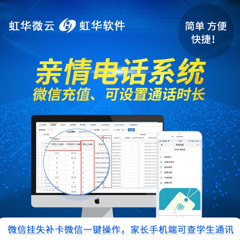 產品詳細介紹 1、話費套餐微信充值:可以直接微信充值電話費; 2、設定親情號碼:每張可捆綁4個親情號碼,親情號碼家長自己可以在微信端自己增刪減改 3、查詢通話記錄:家長和學校可以分別在手機微信端和系統(tǒng)后臺查看學生的通話詳情 4、設定單次通話時長:可設定單次通話時長,對學生通話號碼進行管控,防止非事務性閑聊 5、計費規(guī)則:自定義通話計費規(guī)則 系統(tǒng)不采用寫卡方式,可使用普通的IC卡,卡片丟失后可通過微信移動端直接完成掛失,到管理處補辦一張即可;家長通過關注學生信息的方式可及時了解學生卡內的通話費用余額,及時充值,秒到賬,也可以通過微信直接辦理電話套餐等,所有信息家長均可通過微信及時掌握,簡單!方便!快捷! |