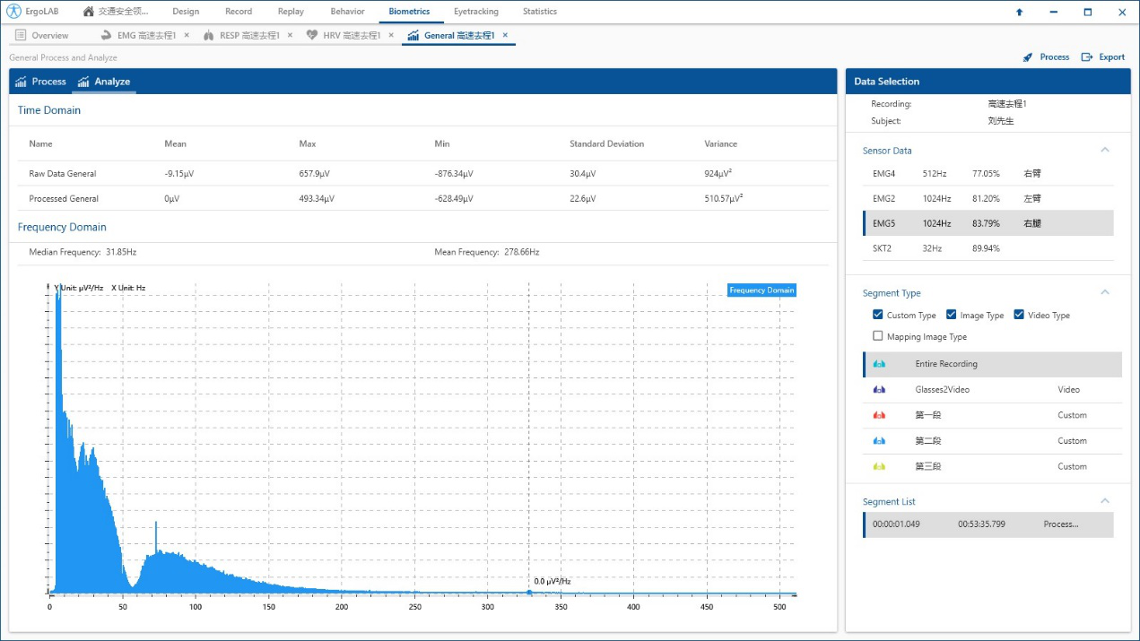 產(chǎn)品詳細(xì)介紹通用信號(hào)數(shù)據(jù)處理與分析 ErgoLAB生理測(cè)試云平臺(tái),除針對(duì)EMG、EDA、HRV、RESP信號(hào)的專業(yè)處理與分析軟件之外,還提供了General基礎(chǔ)通用信號(hào)分析軟件,如生物力學(xué)信號(hào)、環(huán)境信號(hào)、皮溫SKT、眼電等,該分析模塊默認(rèn)為一般化的處理方式,可滿足基本的信號(hào)處理與分析統(tǒng)計(jì)。 其他信號(hào)如生物力學(xué)信號(hào)、環(huán)境信號(hào)、其他生理信號(hào)、眼電信號(hào)等可在 General 一般性分析模塊中進(jìn)行處理與分析。該模塊可以結(jié)合人機(jī)環(huán)境同步平臺(tái)和生理記錄系統(tǒng)采集到的所有生物信號(hào)進(jìn)行離線處理和分析。可對(duì)信號(hào)進(jìn)行自由選擇、放大、縮小,便于查看數(shù)據(jù),在整體呈現(xiàn)數(shù)據(jù)的基礎(chǔ)上,還可以根據(jù)片段、事件、場(chǎng)景三種分割方式進(jìn)行數(shù)據(jù)呈現(xiàn);可導(dǎo)出ASCII格式的原始數(shù)據(jù)、處理后數(shù)據(jù)和分析后數(shù)據(jù);并可導(dǎo)出分析報(bào)告單。