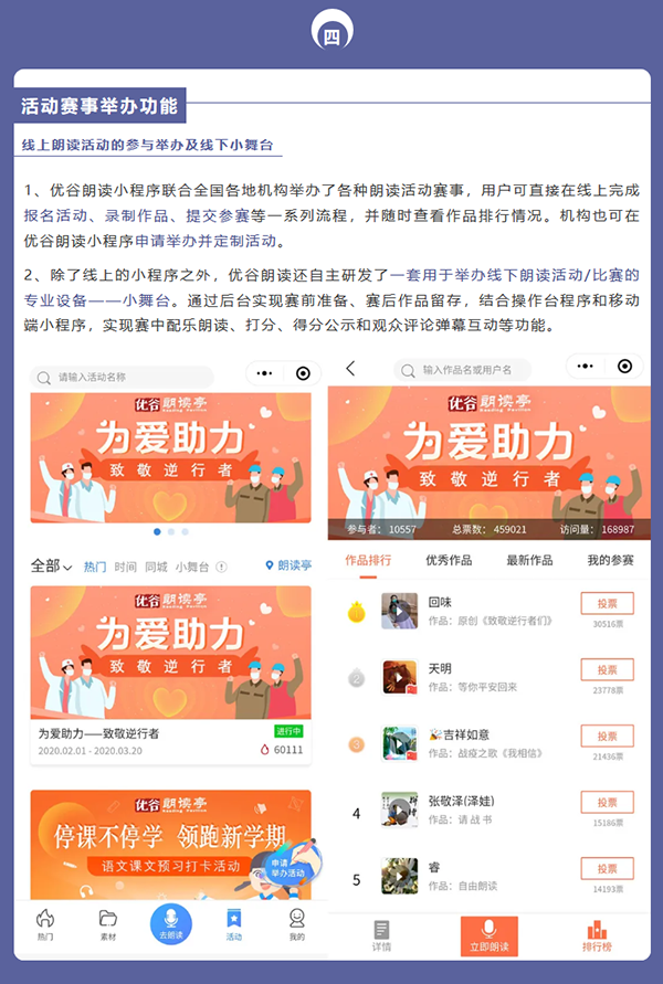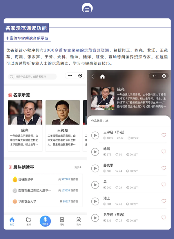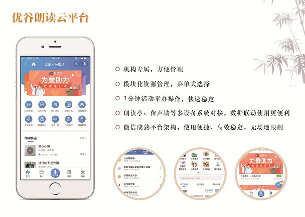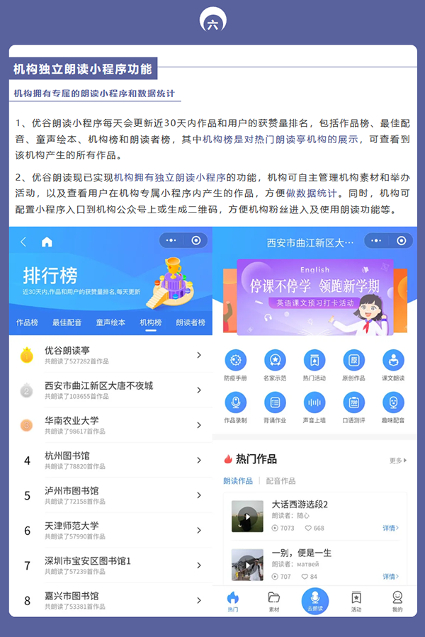 目前,優谷朗讀小程序已具備在線錄制朗讀音頻/視頻作品、留聲卡作品展示、名家示范誦讀、線上活動舉辦和線下小舞臺、背誦作業考核、機構獨立小程序等六大功能,為用戶提供了更加專業用心的服務。