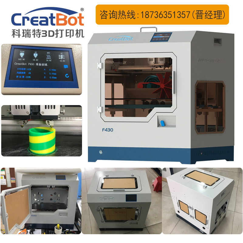 學校招標CreatBot 3d打印機機型參數介紹 F430設備參數: 1.品名:3D打印機 2.品牌:CreatBot/科瑞特 3.型號:F430 4.成型技術:FDM(熔融沉積) 5.打印尺寸:400*300*300mm 6.噴頭數量:2個(雙噴頭3d打印機) 7.噴嘴直徑:0.4mm 8.打印層厚:0.02-0.3mm 9.打印速度:55-120mm/s 10.噴頭最高溫度:260/420°C(一臺3D打印機配四套噴嘴默認安裝一常溫噴頭和一高溫噴頭,并配送常溫和高溫噴頭組件各一套) 11.熱床最高溫度:140°C(新升級配置) 12.工作艙最高溫度:70°C 13.空氣過濾:有空氣過濾功能 14.耗材直徑:1.75mm 15.耗材類型:PLA/ABS/碳纖維/木制/尼龍/PC/PTEG/HIPS/PP/TPU/PVA/PEEK 等 16.機身架構:全封閉精鋼機身、雙Z軸,直線導軌拖鏈架構 17.定位精度:X Y軸定位精度:12.7 微米Z軸定位精度:1.25 微米 18.工作臺:鋼化玻璃面板+BuildTak貼紙 19.操作軟件:CreatWare V6.4.6多國語言版 20.文件類型:STL, OBJ, AMF 21.操作系統:Windows (7,8,10)、Mac OS X 22.操作屏幕:4.3" 彩色觸屏(多國語言) 23.輸出設備:U盤、USB(聯機) 24.電源:100-240V, 50-60Hz 25.機器功率:2000W 26.環境控制:有保溫艙,熱風系統 27.支持功能:自動調平/斷電續打/耗材檢測/自動關機等 28.機器尺寸:620*485*680mm 29.包裝尺寸:750*580*720mm 30.機器重量:48Kg 31.包裝重量:62Kg 產品特點: 1.全封閉金屬機身——時尚外觀設計,機身穩重大方;透明亞克力擋板可封閉打印,安全且便于觀察打印過程。 2.全金屬新式噴頭——近端送絲雙噴頭配置,噴頭熱熔溫度可達420°,打印材料范圍更廣。 3.超大觸摸屏操作——一鍵操作,方便快捷;4.3英寸超大顯示屏,支持中英文多種語言。 4.切片軟件——支持多種語言,默認中文,打印參數可設置默認參數值,操作簡單。 5.斷電續打——意外斷電時,會自動記憶當前位置并存儲打印數據,降低工作臺并回抽耗材。 6.耗材檢測——耗材即將用完時會自動停止打印并退出耗材,更換耗材后可繼續打印。 7.自動關機——打印完成會發出提示音,五分鐘后自動關機,無人值守更放心。