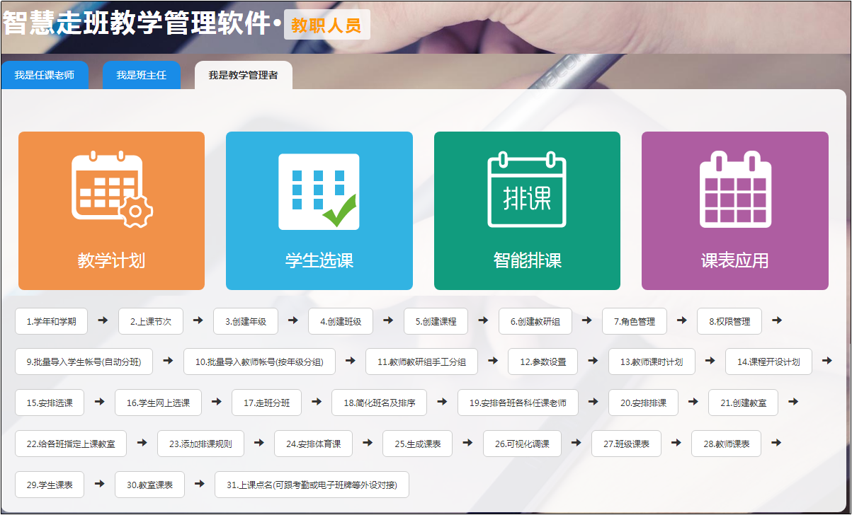 將“行政班級(jí)管理、教學(xué)班管理、功能教室、課程管理、課時(shí)規(guī)劃、開(kāi)課規(guī)劃、選科管理、生涯規(guī)劃、分班管理、排課需求管理、專(zhuān)項(xiàng)課排課、行政課排課、走班課排課、上課點(diǎn)名、課表查詢(xún)、上課評(píng)語(yǔ)”等30多個(gè)小系統(tǒng)統(tǒng)一集成為一個(gè)完備的單一產(chǎn)品,功能完備又不失簡(jiǎn)約;