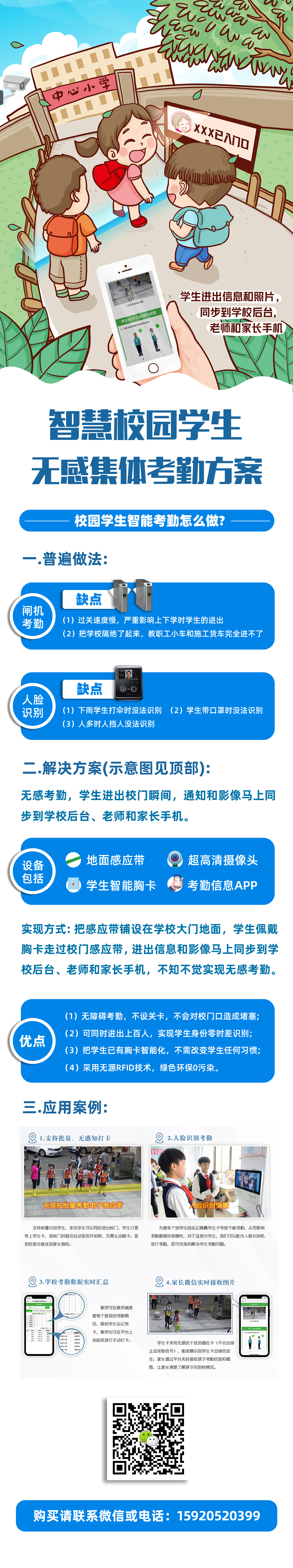 系統功能: 1、學生只需佩戴學生卡進出校門即可自動簽到并實時抓拍照片,無需手動刷卡簽到。 2、支持學生批量進出校門。 3、抓拍到的圖像會通過微信發送到家長手機上。 4、考勤抓拍的照片都是學生的全身照,家長通過照片可獲取學生更多信息,例如孩子今天穿什么衣服,有沒有戴帽子,有沒有撐傘,跟那位同學一起上學、放學等等。 5、已簽到的學生,在考勤表上顯示簽到時的照片,未簽到的學生則留空。 6、教師可在系統上實時查看學生考勤情況。 7、采用多線程信息提交機制,確保簽到信息能準時發送到家長的微信。 8、采用緩存技術,當網絡不穩定時會暫停數據發送,待網絡恢復正常后會自動補發。 9、學生卡采用無源卡片(卡片本身不會發射出任何電磁信號),安全、健康。 10、采用抗干擾學生卡,感應器可準確、穩定識別學生卡。 11、采用多重較驗方法,避免漏讀的情況。 12、采用防水抗壓耐高溫設計,適合戶外使用。 13、采用信號定位技術,避免正門和側門的信號相互干擾。 14、采用智能圖片抓拍技術,避免長時間高頻率抓拍照片對攝像頭造成高負載,保證了設備的穩定運行。 15、采用遠程監控技術,可實時監控考勤主機的運行狀態,可遠程重啟主機,提高故障修復的效率和保證設備的穩定運行。
