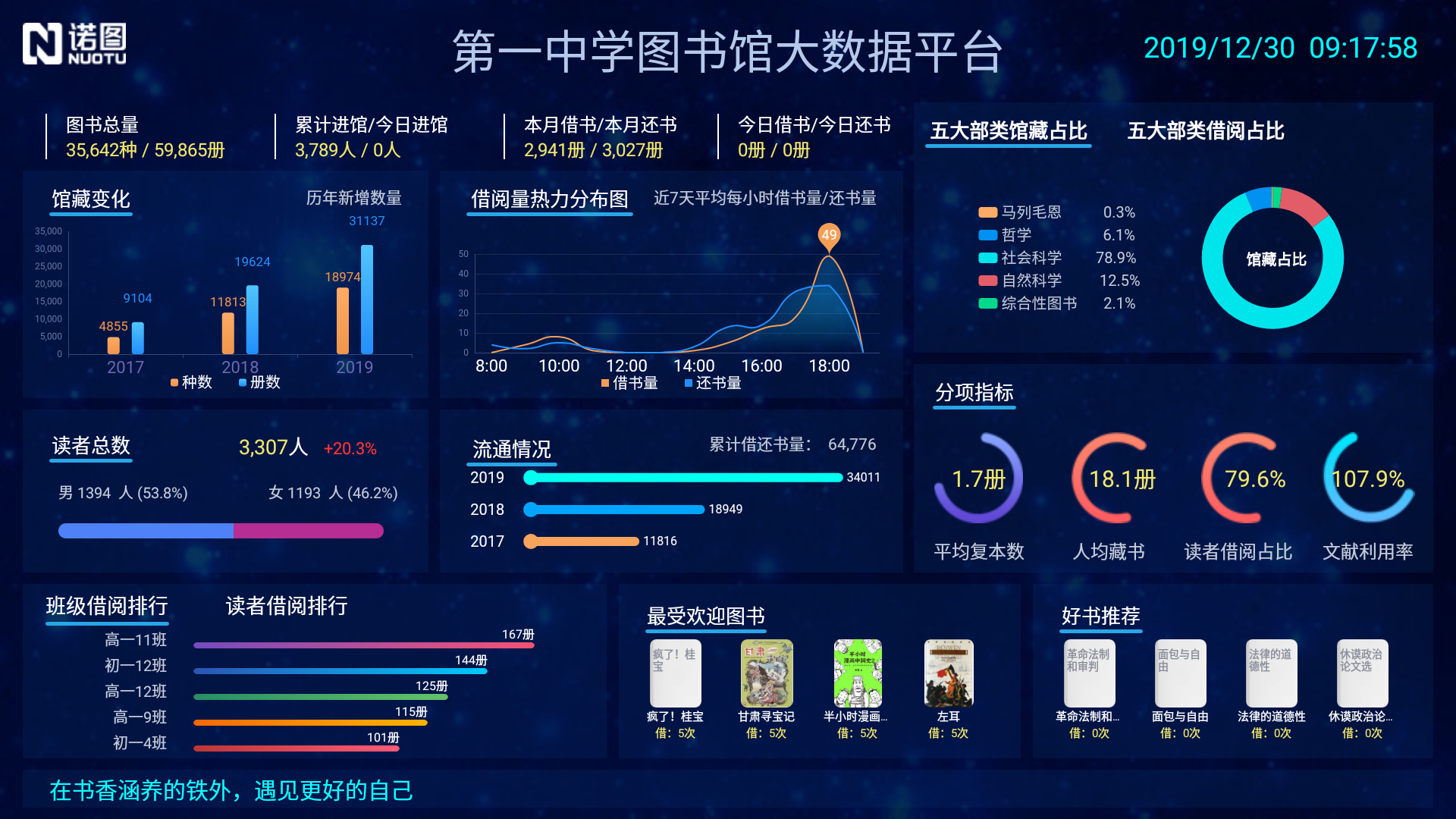 產品詳細介紹圖書館大數據展示墻自動對接云平臺,提取館藏、流通等數據進行加工分析,通過大屏幕對讀者進行展示。可視化數據包括:圖書總量、累計進館、今日進館、今年新增圖書、本月借書、本月還書、今日借書、今日還書、歷年館藏變化、近7天借閱量熱力分布圖、五大類館藏占比、五大類借閱占比、平均復本數、人均藏書、讀者借閱占比、文獻利用率、班級借閱排行、讀者借閱排行、最受歡迎圖書、好書推薦等等。 |