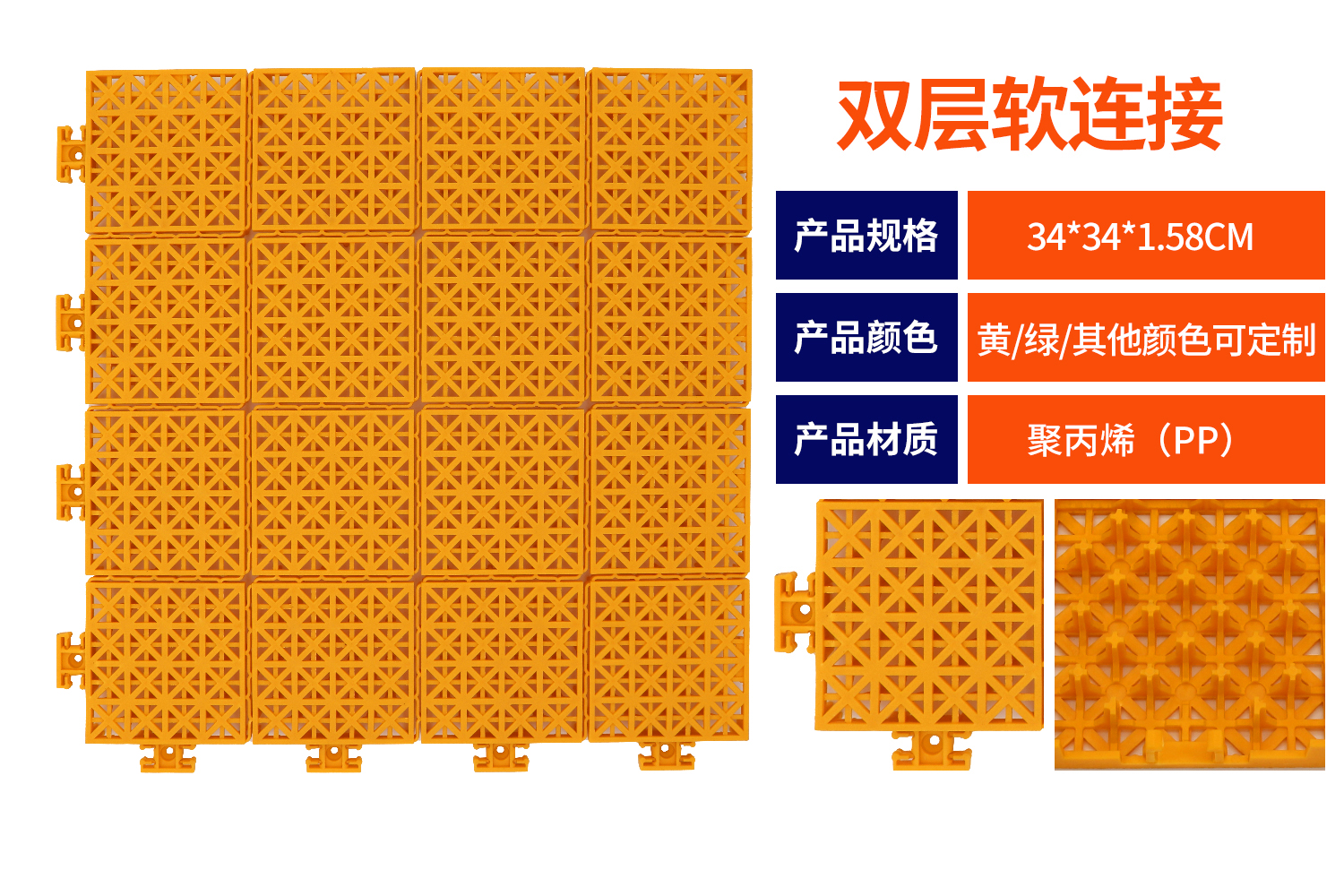 34 (長(zhǎng)) ×34 (寬) ×1.58cm (高) 雙層軟連接 單片重量 340g±5 克 2 、材料: 采用食品級(jí)全新聚丙烯(PP)高強(qiáng)度改性材料和進(jìn)口助劑生產(chǎn),保證產(chǎn)品環(huán)保性和耐侯性 3 、連接方式: 新型方形彈簧式伸縮扣,有效緩解熱脹冷縮(專利設(shè)計(jì)) 4 、自帶隱藏式連接地面螺絲孔: 防止場(chǎng)地地板走位移動(dòng)及地板受氣溫影響引起的拉伸和收縮,能使產(chǎn)品定位 于地面,并不影響美觀及無(wú)任何安全隱患 5 、面層結(jié)構(gòu): 啞光防眩光表面,強(qiáng)光下不刺眼、不反光,防止地板在日照情況下出現(xiàn)眩光情況; 磨砂曬紋表面,增強(qiáng)地板表層耐磨與防滑度,保證雙重緩沖作用,提升運(yùn)動(dòng)安全舒適性, 雙層米字棱形鏤空面層,雙層結(jié)構(gòu)使產(chǎn)品的物理性能加強(qiáng),在長(zhǎng)時(shí)間的戶外鋪裝中,雙層地板的 場(chǎng)地變形基數(shù)遠(yuǎn)低于單面層地板。 6 、底部結(jié)構(gòu): 底部多個(gè)加粗加密式十字形懸浮支撐柱,提供垂直緩沖效果, 導(dǎo)水槽結(jié)構(gòu),實(shí)現(xiàn)快速排水,防止場(chǎng)地大面積積水。
