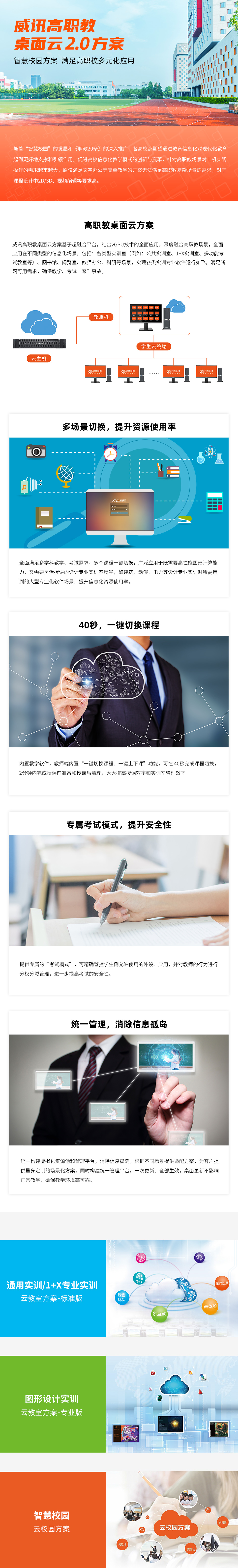 產品詳細介紹針對傳統PC計算機機房存在的眾多弊端,升騰威訊云教室標準版方案以教學智能化、運維簡捷化、校園綠色化為最終目標,提出了一個以云計算為框架的解決方案,它以云主機和云終端為主體,采用先進的ViCVDI桌面虛擬化技術,集中管理,分布式運算,構建新型的教學模式,將計算機教室帶入云時代。ViCVDI(VisionClient-VDI)桌面虛擬化技術下,云終端既可以選擇優先調用本地硬盤上的桌面,也可以選擇從服務器端上調用桌面到本機運行,并通過統一管理平臺上的管控模塊進行終端行為管理,從而實現用戶桌面的全面防護和統一管理。升騰威訊云教室標準版解決方案可以讓虛擬化的操作系統從引導階段就開始接管計算機硬件平臺,直接工作在本機的硬件平臺之上,不再需要下層系統的支撐。建議學校實訓信息化教室、數字圖書閱覽室、考試教室場景,采用威訊桌面云ViCVDI客戶端計算模式。 |