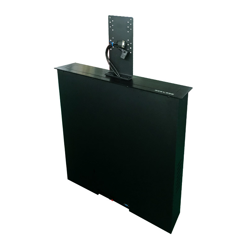二、產品特性: ① 雙電機雙桿導向傳動、升降穩定性強。 ② 高光鋁合金拉絲面板。 ③ 支持遙控、手控、中控。 ④ 內部走線采用坦克鏈傳動防夾線方式,可防止產品升降卡線。