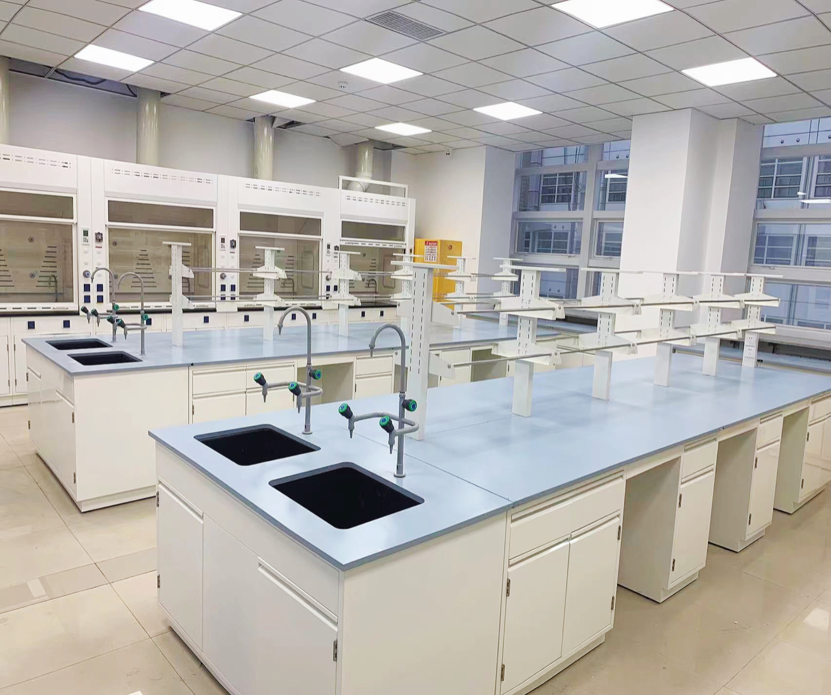 產(chǎn)品詳細(xì)介紹 全鋼實(shí)驗(yàn)臺(tái)是廣泛應(yīng)用于科研、教育、化工、生物制藥等企事業(yè)單位的實(shí)驗(yàn)室設(shè)備,主要放置在實(shí)驗(yàn)室中間,用于實(shí)驗(yàn)操作、放置大型儀器設(shè)備及進(jìn)行檢測(cè)實(shí)驗(yàn)。以下是對(duì)全鋼實(shí)驗(yàn)臺(tái)的詳細(xì)介紹: 一、基本概述 定義:全鋼實(shí)驗(yàn)臺(tái)是由鋼材作為主要材料制成的實(shí)驗(yàn)臺(tái),具有承重能力強(qiáng)、耐腐蝕、易清潔等特點(diǎn)。 應(yīng)用領(lǐng)域:廣泛應(yīng)用于大學(xué)、職業(yè)學(xué)校、科研機(jī)構(gòu)、化工廠、生物制藥企業(yè)等實(shí)驗(yàn)室環(huán)境。 二、材質(zhì)與結(jié)構(gòu) 臺(tái)面材質(zhì):全鋼實(shí)驗(yàn)臺(tái)的臺(tái)面可采用多種材料,如實(shí)芯理化板、貼面板(包括環(huán)氧樹脂板、酚醛樹脂板、花崗巖、不銹鋼臺(tái)面、陶瓷等),這些材料均具有良好的耐腐蝕性和耐磨性。 柜體材質(zhì):所有鋼質(zhì)柜體通常采用1.0/1.2mm厚的優(yōu)質(zhì)冷軋鋼板制成,表面經(jīng)過多道防腐處理 ,如電鍍彩鋅、酸洗、磷化并靜電粉沫噴涂環(huán)氧化樹脂防護(hù)層,以確保其防酸堿抗腐蝕性能。 框架結(jié)構(gòu):支承橫梁和支撐立柱均采用冷軋矩形鋼管,表面同樣經(jīng)過防腐處理。支撐立柱可直接懸掛呆柜,無需破壞墻身,整體結(jié)構(gòu)穩(wěn)固合理。 三、功能與特點(diǎn) 承重能力強(qiáng):全鋼實(shí)驗(yàn)臺(tái)設(shè)計(jì)合理,靜態(tài)承重能力通常超過260-500公斤,能夠滿足大型儀器設(shè)備的放置需求。 耐腐蝕:臺(tái)面、柜體和框架均經(jīng)過防腐處理,能夠在實(shí)驗(yàn)室的酸堿環(huán)境中長期使用而不受損壞。 易清潔:表面平滑無縫隙,易于清潔和維護(hù),符合實(shí)驗(yàn)室的衛(wèi)生要求。 靈活可調(diào):試劑架、層板等可根據(jù)實(shí)際需求自由調(diào)節(jié)高度和位置,滿足不同實(shí)驗(yàn)的需求。 四、配件與附件 插座:采用實(shí)驗(yàn)室專用安全產(chǎn)品,具有防塵、防濺、防水、防酸堿等性能。 滑軌與鉸鏈:引進(jìn)德國和英國技術(shù),確保承重性和滑動(dòng)性能良好,無噪音。 拉手與地腳:拉手通常采用304不銹鋼或一字型暗拉手; 地腳具有防滑、減震、耐酸堿、耐腐蝕等特點(diǎn)。 水槽與水嘴:實(shí)驗(yàn)室專用PP水槽和銅質(zhì)瓷閥芯水嘴,表面經(jīng)環(huán)氧樹脂靜電粉沫噴涂處理,具有良好的耐酸堿性。