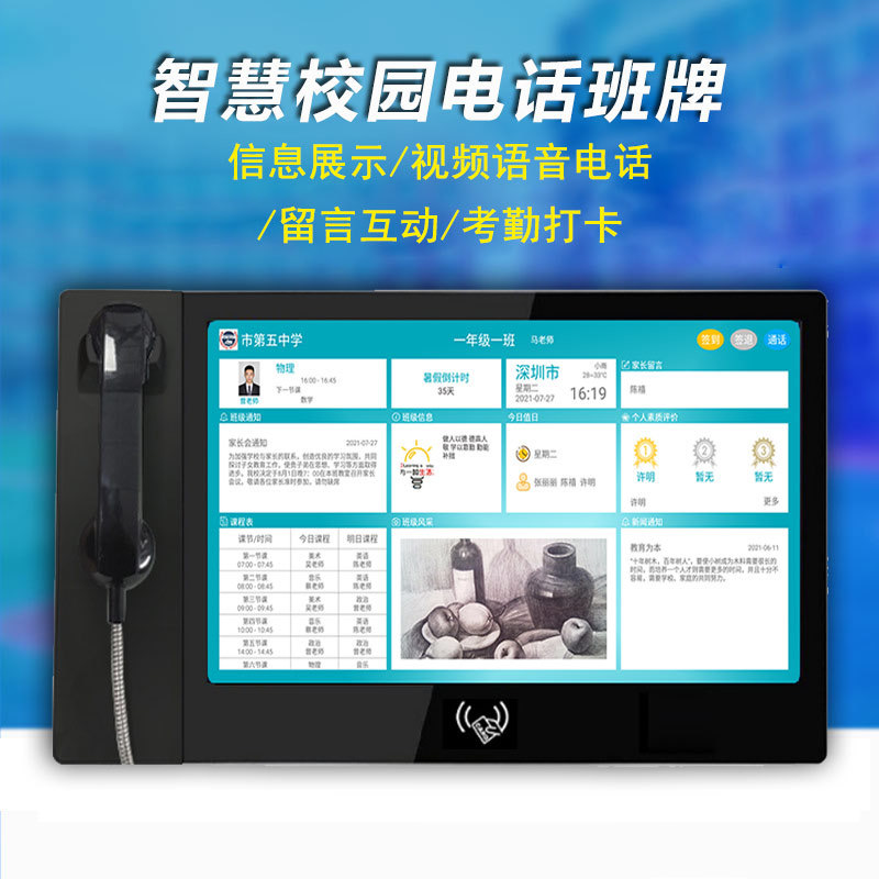 產品詳細介紹.基礎公共信息:包括學校名、學校 Logo、班級名稱、班主任、班級人數、當天考勤統計、時間,天氣等信息; 2.新聞資訊:展示最新信息摘要,可點擊進入查看詳情; 3.留言:家長通過客戶端向學生進行文字或語音留言,即時收到客戶端發出的信息后,在屏幕上方則滾動播放出學生姓名,提示有留言信息,學生需通過刷學生卡讀取留言內容,學生查看后可進行回復; 4.通知公告:學校通過管理平臺發布全校性通知,屏幕上方則滾動播放通知內容,可進行點擊查看詳情; 班級風采:班主任老師通過管理平臺發布上傳班級活動精彩瞬間的圖片; 5.班級名片:各班級可自由設計班級的名片及班級口號,并發布到班牌上進行展示; 6.任務計劃:根據學校的任務計劃,進行倒計時設置。 7.課堂詳情:展示當前課程及當天課程授課老師的詳細內容、上課時間,以及每位老師對本節課程的教學要點提醒,課堂作業及老師的寄語,便于學生提前了解課程要點,可更好地掌握知識點; 8.親情通話:學生人臉識別后可與家長進行音視頻通話; 9.留言互動:學生和家長可以進行留言互動 10.考勤打卡:支持刷卡或人臉識別考勤打卡以及考勤統計匯總查詢。 |