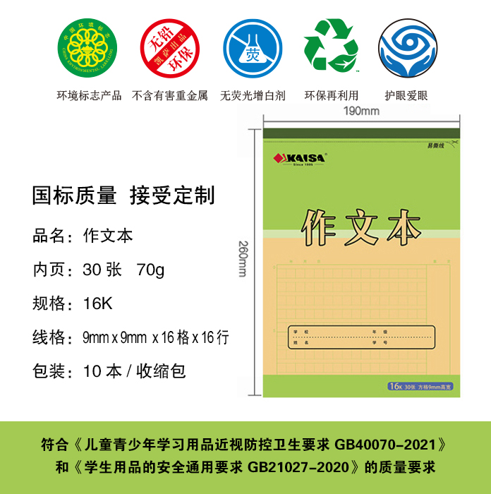 產品詳細介紹1、白度<85%米黃色紙張,緩解用眼疲勞;線格水性油墨清晰印刷、不含有害重金屬。 2、100克牛皮紙封面有效保護內頁;150克牛皮紙封底,挺括耐磨。 3、鐵釘包背,無膠環保裝訂,可360°翻頁;采用易撕線設計,撕取方便整齊。 4、10本裝收縮膜防潮防塵;雙瓦楞外箱。 5、產品符合國家強制標準《學生用品的安全通用要求GB21027-2020》和《兒童青少年學習用品近視防控 衛生要求GB40070-2021》的質量要求 |