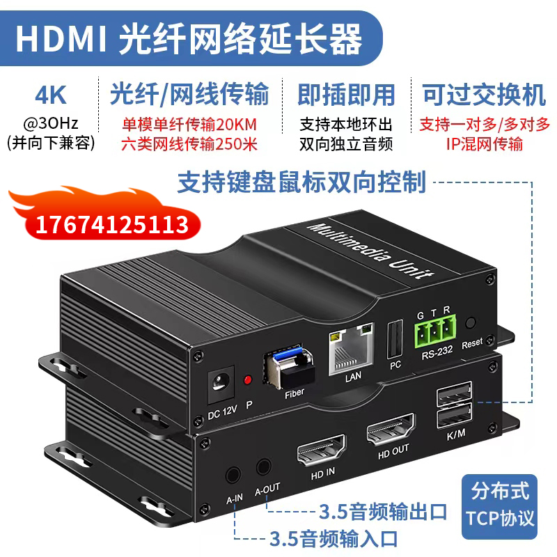 該設備光纖傳輸可達 20 公里、網線傳輸最遠 250 米,支持 4K@30Hz 高清分辨率,兼容 HDMI1.4、HDCP1.3 標準,具備本地視頻環出、RS232 串口控制、OSD 功能及獨立音頻輸入輸出,還支持鼠標鍵盤遠程控制,信號延時不超 0.2 秒,可實現 1 對 1、1 對 1、多對多混網傳輸,內置靜電保護與自動均衡系統。