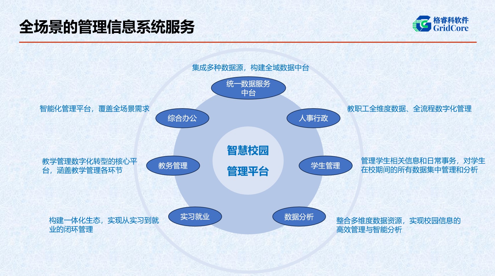 產(chǎn)品詳細(xì)介紹智慧校園管理平臺(tái)包括統(tǒng)一數(shù)據(jù)服務(wù)中臺(tái)系統(tǒng)、綜合辦公系統(tǒng)、人事行政系統(tǒng)、教務(wù)管理系統(tǒng)、學(xué)生管理系統(tǒng)、實(shí)習(xí)就業(yè)系統(tǒng)、數(shù)據(jù)分析系統(tǒng)。
