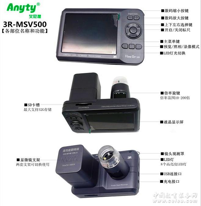 產品簡介 » 3R-MSV500是由3R推出的一款令人驚艷的多功能便攜式視頻顯微鏡。配備500萬像素高清鏡頭、1/3 " 彩色CMOS傳感器、3.5寸液晶顯示屏、1800mAH高性能鋰電池,真正做到隨時隨地現場檢測,細膩的顯微放大效果及便于攜帶、易操作等特性深受客戶喜愛,作為大型臺式顯微鏡設備的一個很好的補充,3R-MSV500已成為科研教育、工業檢測、古玩鑒賞、警用刑偵等行業的必備設備!