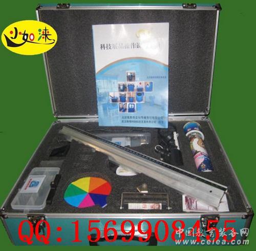 立柱一根、立座底板一個、鐵夾一個、電池一對、電源盒一個、刀開關一個、導線三根、三色燈座一個、燈泡一個、密封有機管一個、玻璃棒一根、彩畫紙一張、三棱鏡一個、平面鏡一面、白屏一片、光具座一個。