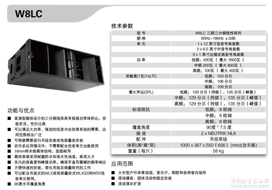 產品詳細介紹緊湊型箱體設計的三分頻線陣具有格高功率體積比,安裝靈活,性價比高,可以滿足大功率,強勁的低音沖擊效果系統的需要,應用范圍相當廣泛,可根據需要進行吊掛安裝或地面疊放安裝,在許多應用情況中,不需要配合低音單元也能使用,18MM樺木板箱體結構,堅固耐用,箱體表面采用耐磨防水保水性油漆,美觀大方,非凡的保真度和峰值功率,確保平直而震撼的頻率響應,方便快速的安裝,簡化吊掛及堆疊陣列的工作 ,可以配合吊掛式的WLX或地面疊放WLXG和WSX低音單元使用,90度水平覆蓋角度。 |