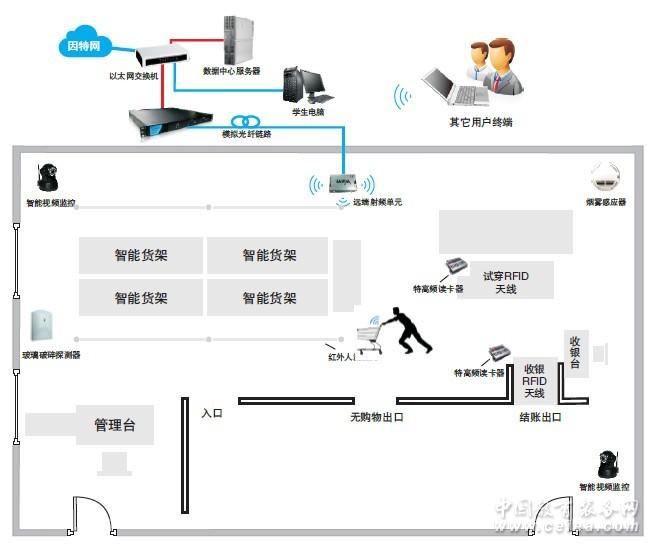 通過整體RFID、無線傳感器網(wǎng)絡(luò)、WiFi等物聯(lián)網(wǎng)綜合技術(shù),加以配備必要的賣場(chǎng)設(shè)施設(shè)備布置,實(shí)現(xiàn)人流量檢測(cè)、商品識(shí)讀和動(dòng)態(tài)監(jiān)控、動(dòng)態(tài)盤點(diǎn)、補(bǔ)貨提醒、智能上架、智能揀貨、電子價(jià)簽制作、商品信息推送、購物引導(dǎo)、試穿體驗(yàn)統(tǒng)計(jì)、環(huán)境監(jiān)控、自動(dòng)結(jié)算、商品追溯查詢等智慧超市應(yīng)用。
