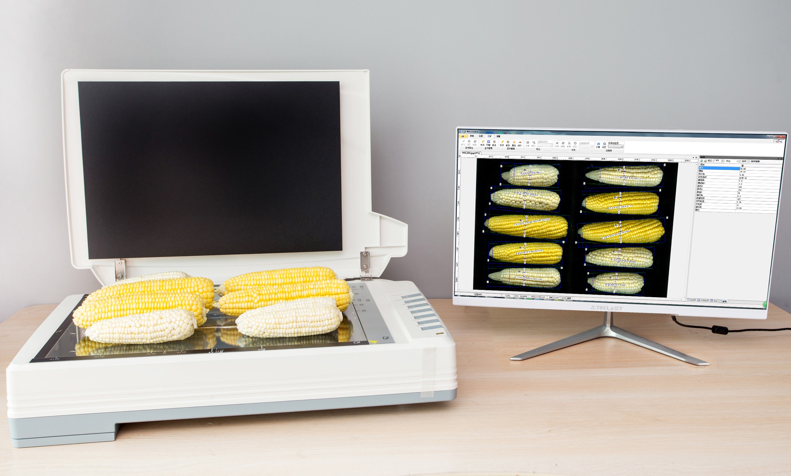 產品詳細介紹SC-G型自動考種及千粒重分析儀(含玉米果穗考種) 貨物名稱:SC-G型自動考種及千粒重分析儀(含玉米果穗考種) 玉米自動考種及千粒重分析儀 所配的各種種粒自動考種及千粒重分析儀 一、用途 用于各類農作物實粒種子(谷粒、玉米、小麥、油菜籽等)的精確考種,各類糧庫的蟲口計數分析。可兼做表面光滑的昆蟲計數或蟲卵計數(如:米象、蚜蟲、蠶卵、魚籽等),以及被當作種子凈度工作臺用于種子凈度檢驗。 二、主要技術指標 1、配最高分辨率1600dpi × 1600dpi紫光M1彩色掃描儀,掃描分析區為A3幅面431.8mm×304.8 mm。可同時成像分析除黑玉米和雜色花玉米以外的10個玉米果穗、35個玉米截面、1000粒左右玉米籽粒。 2、配大景深的500萬像素彩色拍攝儀及A3幅面超薄背光燈板,具有相機畫面畸變、背光板均勻性的自動矯正特性,有效減小尺寸測量誤差。 3、籽粒考種分析: (1)可分析各類種粒的直徑1.0~20mm。玉米籽粒自動數粒速度1500~3000粒/分鐘,對于直徑較小的種粒(如油菜籽、蔬菜籽)單批次考種數量5000~10000粒/分鐘,其它籽粒為1200~20000粒/分鐘,數粒誤差≤±0.1~0.4%,監視修正即達100%正確。自動千粒重分析的精度誤差≤±0.5%。 (2)★具有自學習和增強學習種粒顏色、形狀自動分類的特性,能實現品種差異比對的特性,及具有按英國皇家園林協會RHS比色卡的比色特性來分析種粒顏色。 (3)★可根據實際需求自行創制一鍵自動分析向導,可自動精確考種水稻、小麥、玉米、豆類、油菜籽、瓜子、蔬菜籽等各類農作物籽粒。 (4)★能大批量自動分析成像后的種粒圖片,自動測出籽粒數、各籽粒的粒形參數(長、寬、長寬比、面積、等效直徑、周長等),以及其平均值,能精準顯示種粒外接矩形,可自動排序輸出,及可輸出粒徑分布圖表。 4、★玉米果穗、截面考種分析: (1)同時成像分析玉米果穗10個/次/分鐘、玉米截面35個/次/分鐘。 (2)全自動測出各玉米穗長、穗粗、禿尖長、左右穗緣角、穗行角、平均行粒數、粒厚、截面穗行數、穗粗、軸粗,以及其平均值,可自動測出各玉米截面上的平均粒長、平均粒寬等參數。 5、分析過程為全程電腦控制,高效、準確、簡便易用,真正一鍵式操作,鼠標一點,結果即現。具有被測樣本條碼、電子天平RS232重量數據的自動輸入接口。 6、可用鼠標選擇增加/刪除,或直接用鼠標在屏上手工計數,以確保100%正確目標區的個性化計數,也可對工作區視野中任選范圍或矩形范圍內的計數。 7、分析圖像結果可保存,能自動形成總報表,統計分析結果可輸出保存至Excel表。 以及按寬度、長度、面積等輸出的排列圖和測量圖。 8、儀器有云平臺支持,可將分析數據保存到云端隨時隨地查看。