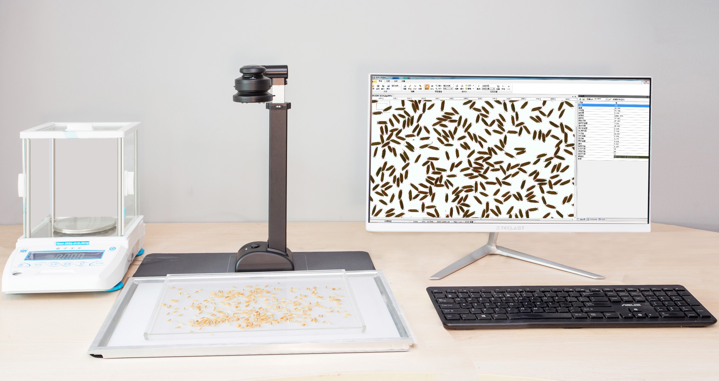 產品詳細介紹一、用途 用于各類農作物實粒種子(谷粒、玉米、小麥、油菜籽等)的精確考種,各類糧庫的蟲口計數分析。可兼做表面光滑的昆蟲計數或蟲卵計數(如:米象、蚜蟲、蠶卵、魚籽等),以及被當作種子凈度工作臺用于種子凈度檢驗。 二、主要技術指標 1、大景深的800萬像素彩色拍攝儀及A3幅面超薄背光燈板,具有相機畫面畸變、背光板均勻性的自動矯正特性,有效減小尺寸測量誤差。 2、★能大批量自動分析成像后的種粒圖片。拍照分析的種粒直徑0.5~20mm。稻種的實粒與秕谷需經風選,再分別計數分析。 3、★具有自學習和增強學習種粒顏色、形狀自動分類的特性,及實現品種差異比對的特性。 4、★可根據實際需求自行創制一鍵自動分析向導,可自動精確考種水稻、小麥、玉米、豆類、油菜籽、瓜子、蔬菜籽等各類農作物籽粒,自動計數各類糧庫的蟲口,以及分析出苗數、均勻度,顯示和輸出計數結果。 5、能自動測出各類粘連種粒的每粒粒形參數(長、寬、長寬比、面積、等效直徑、周長等),能精準顯示種粒外接矩形,并可自動排序輸出,及可輸出粒徑分布圖表。 6、全自動數粒速度1200~20000粒/分鐘,數粒誤差≤±0.1~0.4%,極少監視修正即達100%正確。全自動千粒重分析的精度誤差≤±0.5%。對于直徑較小的種粒(如油菜籽、蔬菜籽),單批次考種數量在5000~10000粒。 7、分析過程為全程電腦控制,高效、準確、簡便易用,真正一鍵式操作,鼠標一點,結果即現。具有被測樣本條碼、電子天平RS232重量數據的自動輸入接口。 8、可用鼠標選擇增加/刪除,或直接用鼠標在屏上手工計數,以確保100%正確目標區的個性化計數,也可對工作區視野中任選范圍或矩形范圍內的計數。 9、分析圖像結果可保存,能自動形成總報表,統計分析結果可輸出保存至Excel表,以及按寬度、長度、面積等輸出的排列圖和測量圖。 10、儀器有云平臺支持,可將分析數據保存到云端隨時隨地查看。 三、標準配置 1、SC-G自動考種分析及千粒重儀系統軟件U盤及軟件鎖1套 2、大景深的800萬像素彩色拍攝儀1臺 3、A3幅面超薄背光燈板1套 4、帶RS232通訊接口的量程220g電子天平(精度1mg)1臺 5、RS232接口通訊傳輸線1條 6、種粒成像盤1個 7、種粒收納小盤1個 備注: 1、本技術標書中打★款項必須響應,否則為重大偏離。 2、本產品需使用電腦,推薦:品牌電腦(12代以上酷睿i5 CPU/8G內存/512G硬盤/21.5”彩顯,1個USB3.0+3個USB2.0口,Windows 10或11完整專業版)。 |