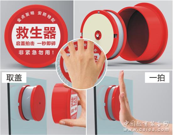 一種按壓式的小盒子,內含有擊穿玻璃的鎢鋼合金釘,粘貼在公交車玻璃窗角。使用時,打開保險蓋,用手拍擊,即可實現逃生。此產品由深圳中發明科技開發有限公司研發,通過大量實驗,能在1秒鐘時間快速1次實現破窗救生。老人、小孩、女士均可使用。